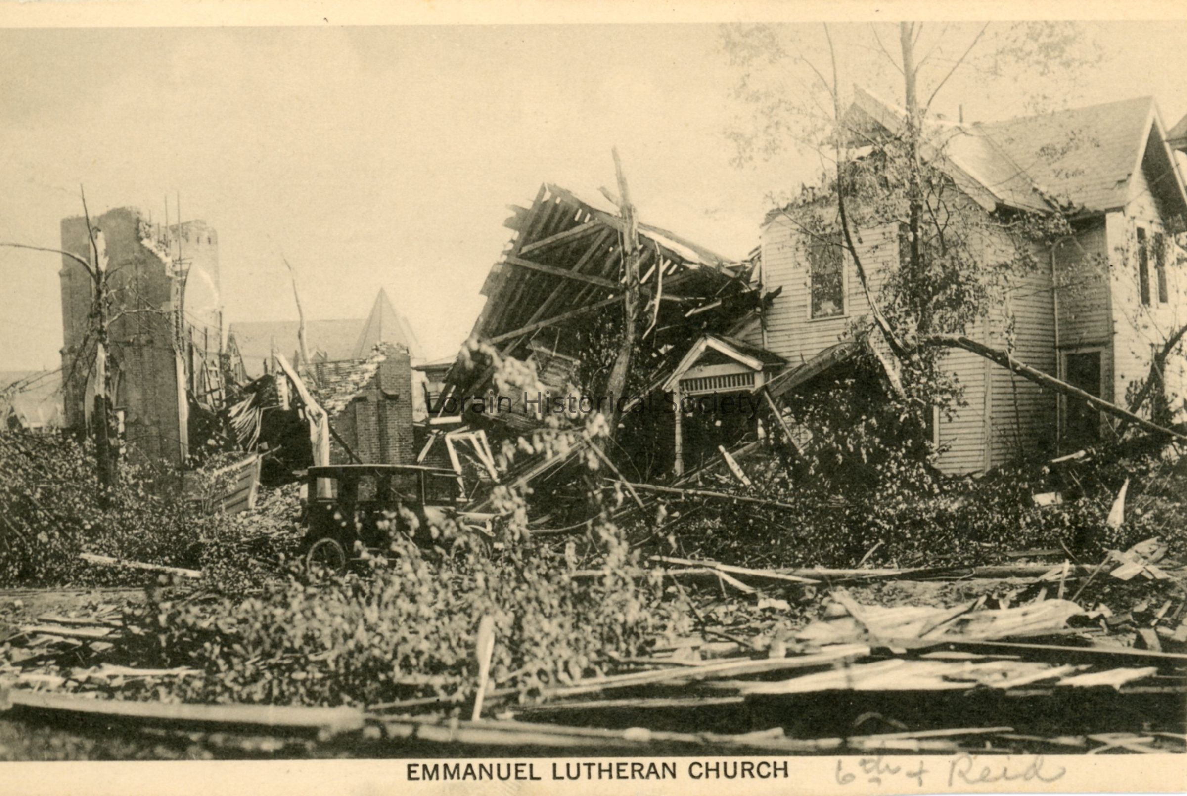 Postcard print is view of Emmanuel Evangelical Church, NW Corner of West Sixth Street and Reid Avenue, showing damage and destruction from 1924 Tornado. Postcard reads: "EMMANUEL LUTHERAN CHURCH".Acquisition