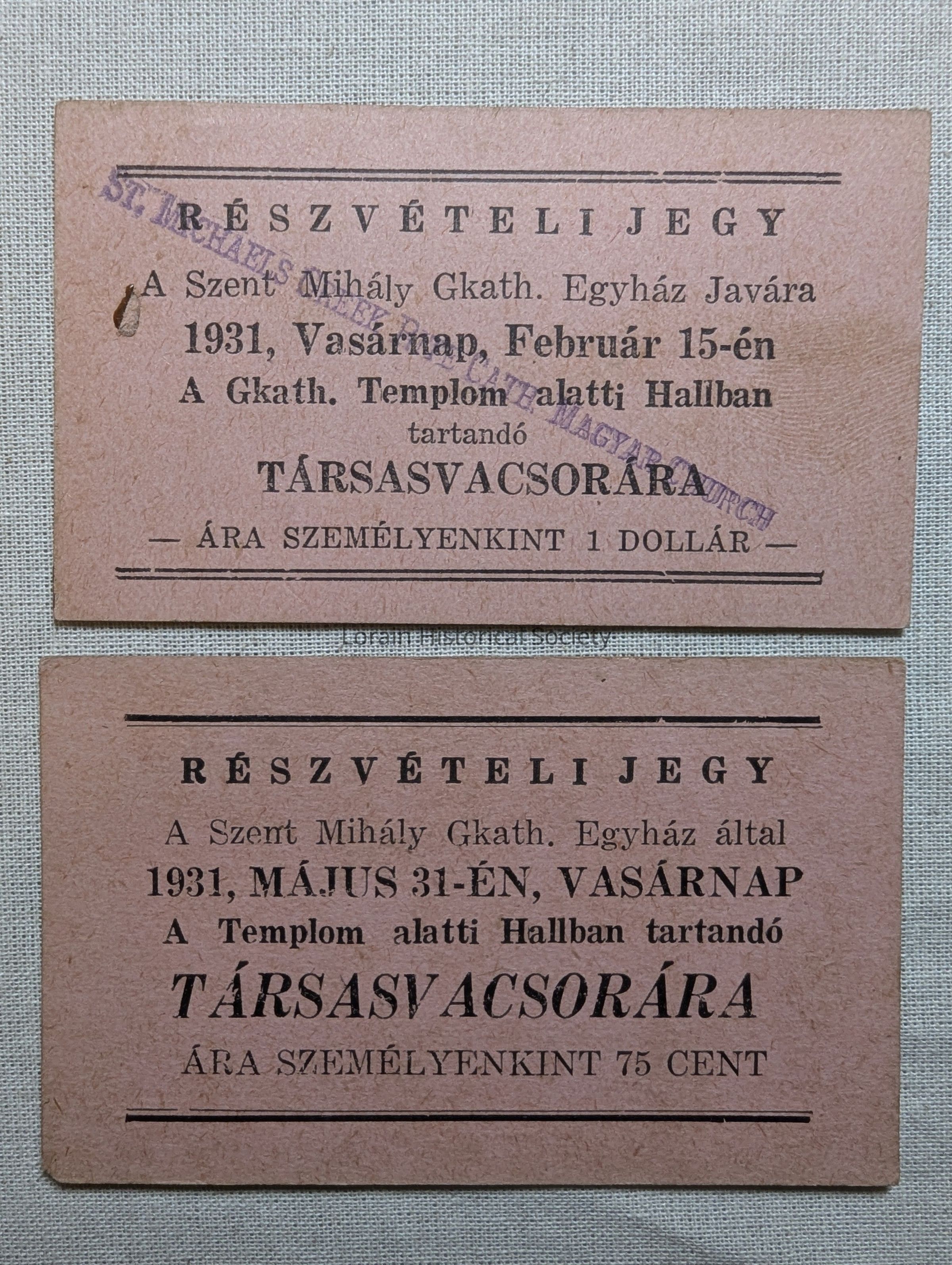 Two tickets for a dinner to benefit St. Michael's Catholic Church; one for February 15, 1931 and one for May 31, 1931; in Hungarian - see photos below for translationAcquisition