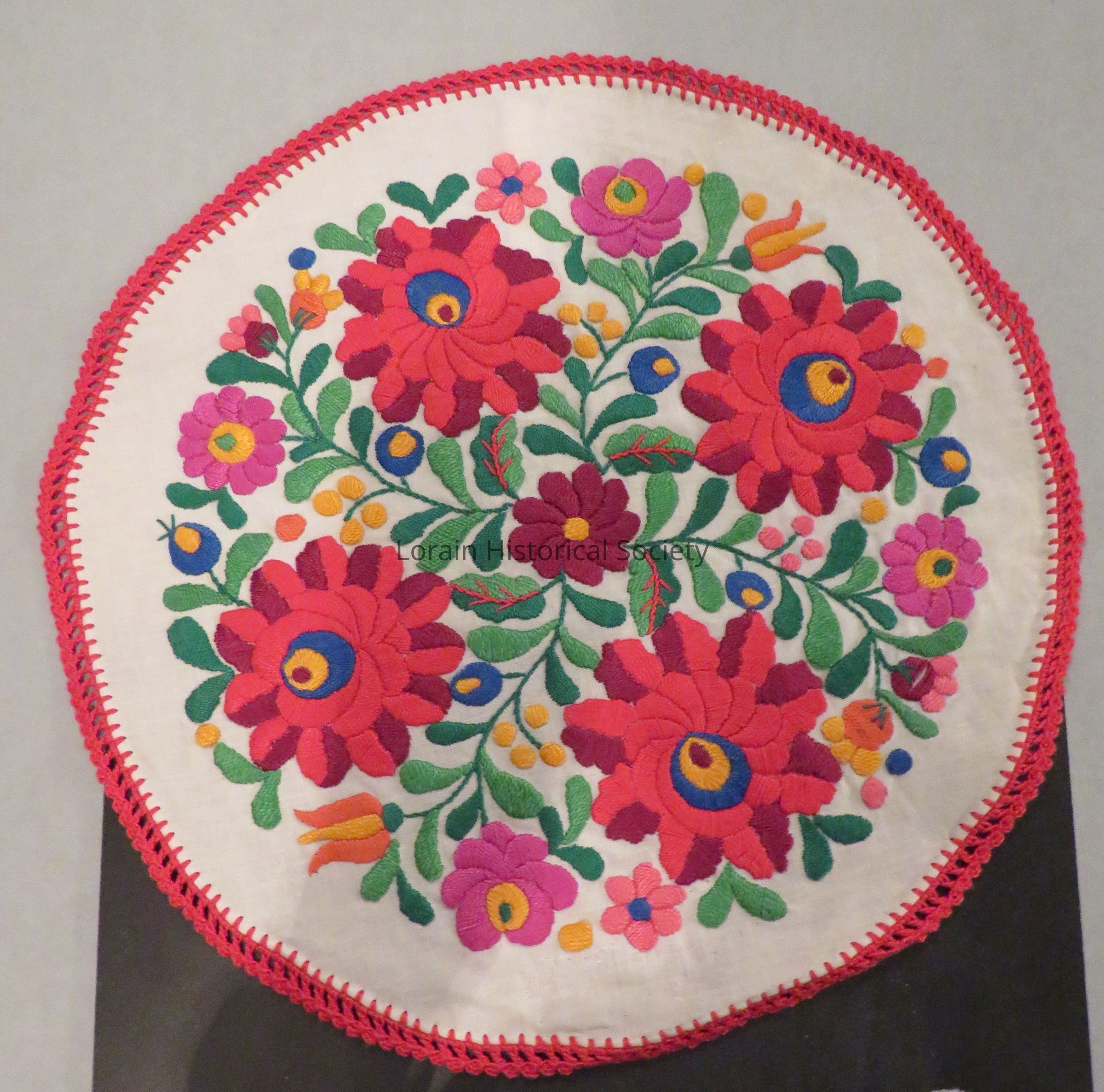 12 inch round embroidered doily, floral design; white with red stitched edging.
