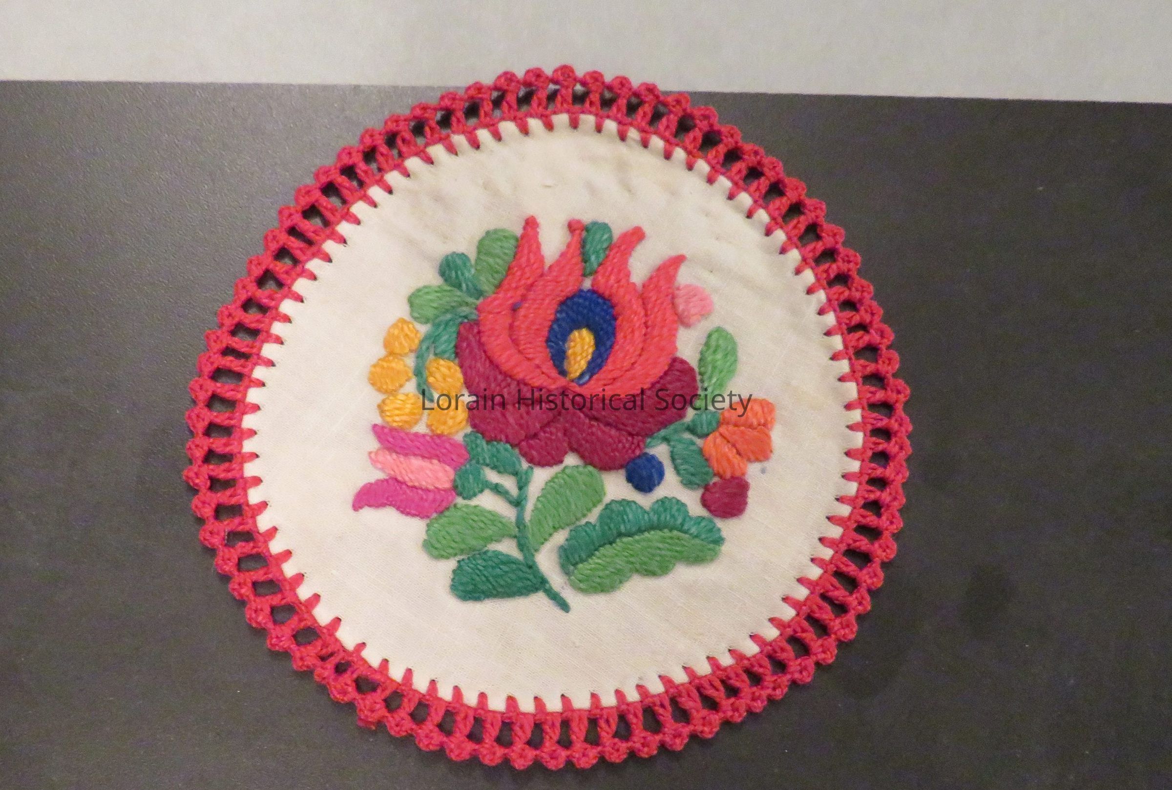 4 inch round embroidered doily; white with red stitched edge.