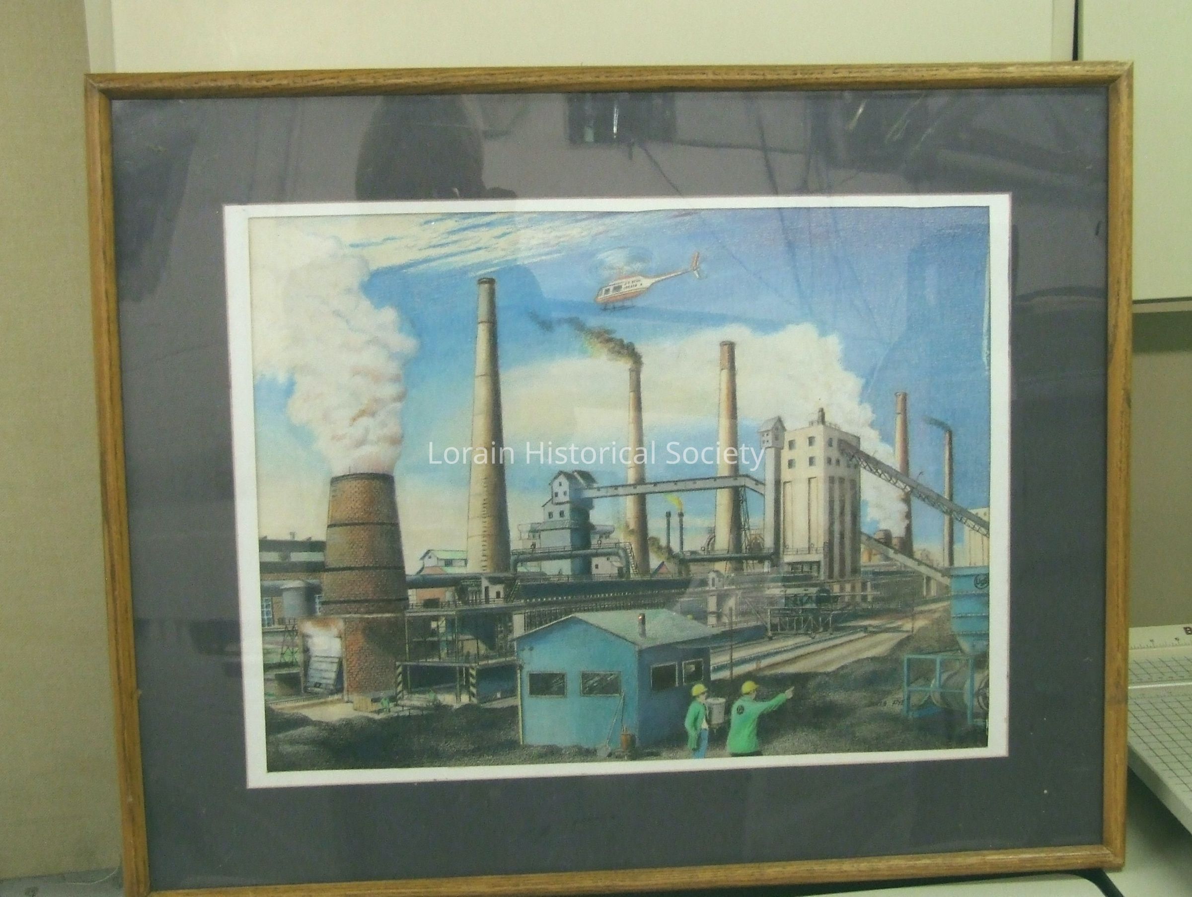 Colored pencil depiction of the coke plant at US Steel, Lorain, OH; artwork is in a wooden frame measuring 31 x 25.75 inches.