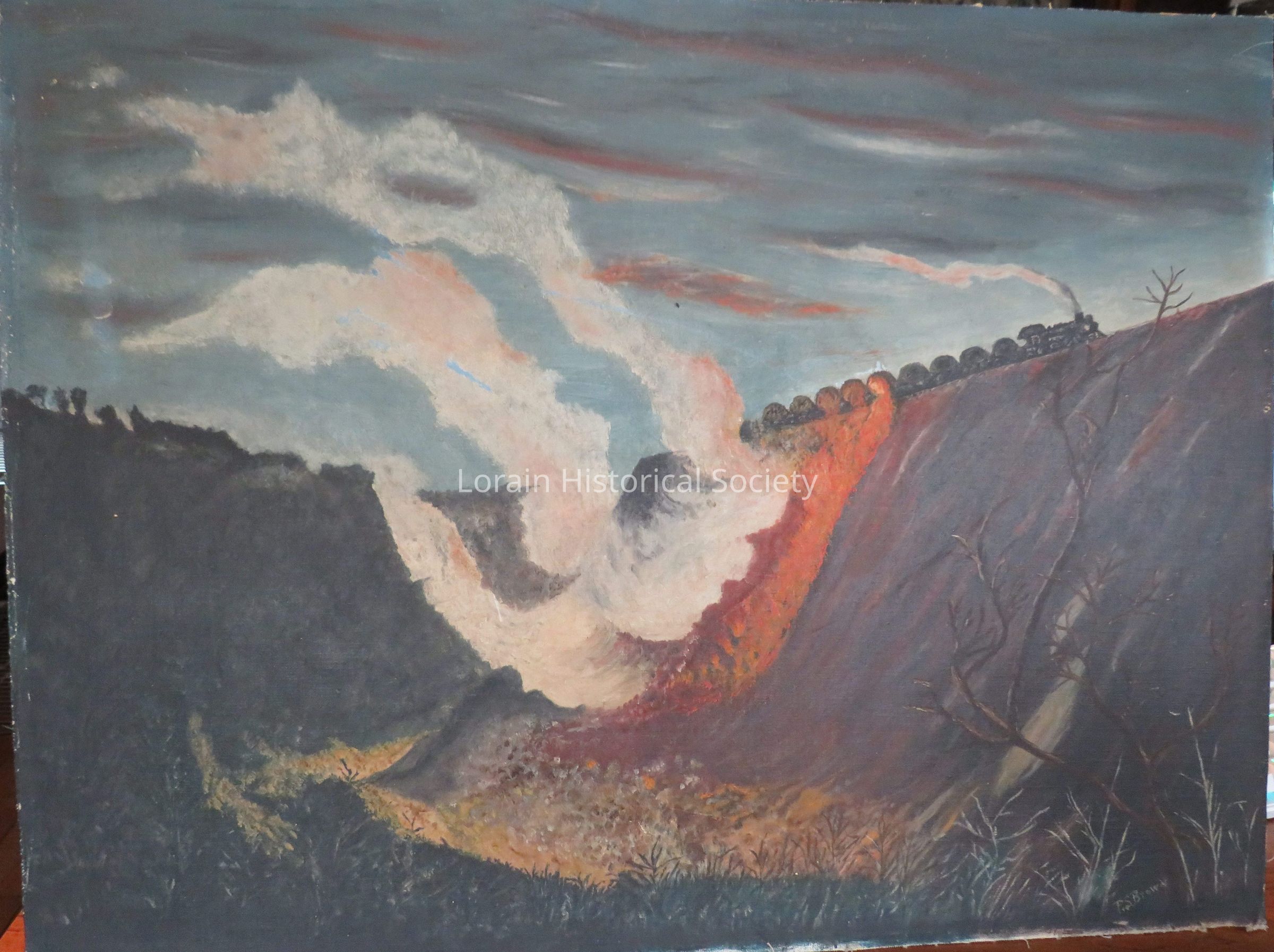 Painting of a train dumping containers of molten blast furnace residue (slag) into a pit on property owned by USS Lorain Works. View from possibly the 21st Street bridge area - or at least this was a sight many remember seeing from the 21st Street Bridge.Context