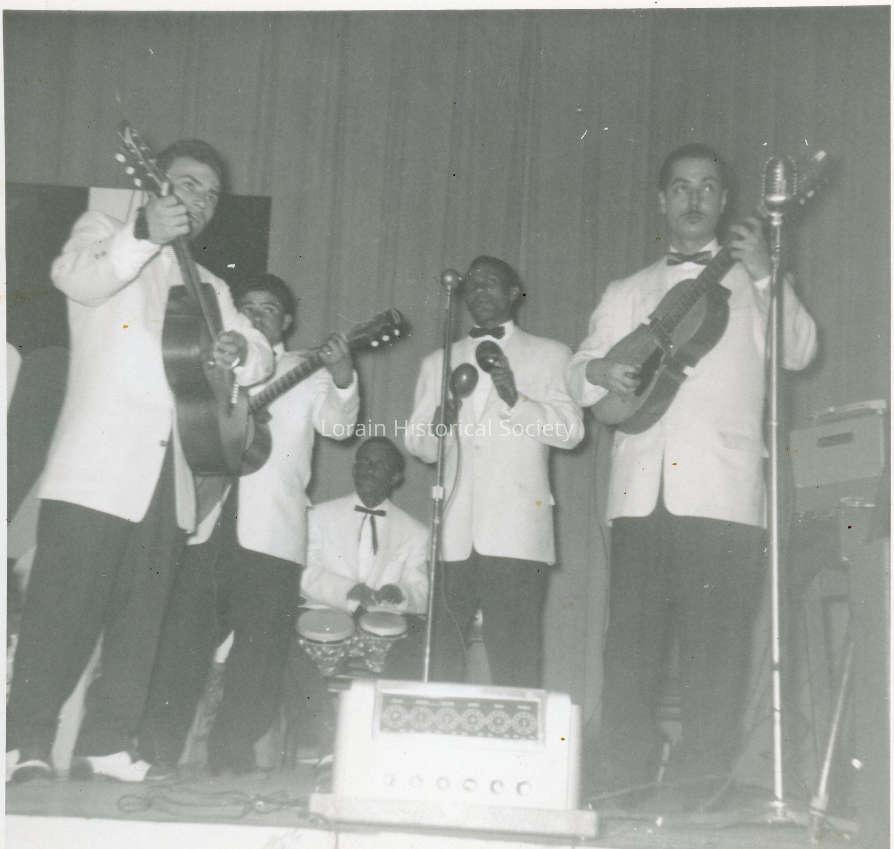 Musical group playing at Club Benefico. Five men singing and playing instruments on a stage.Photograph Details