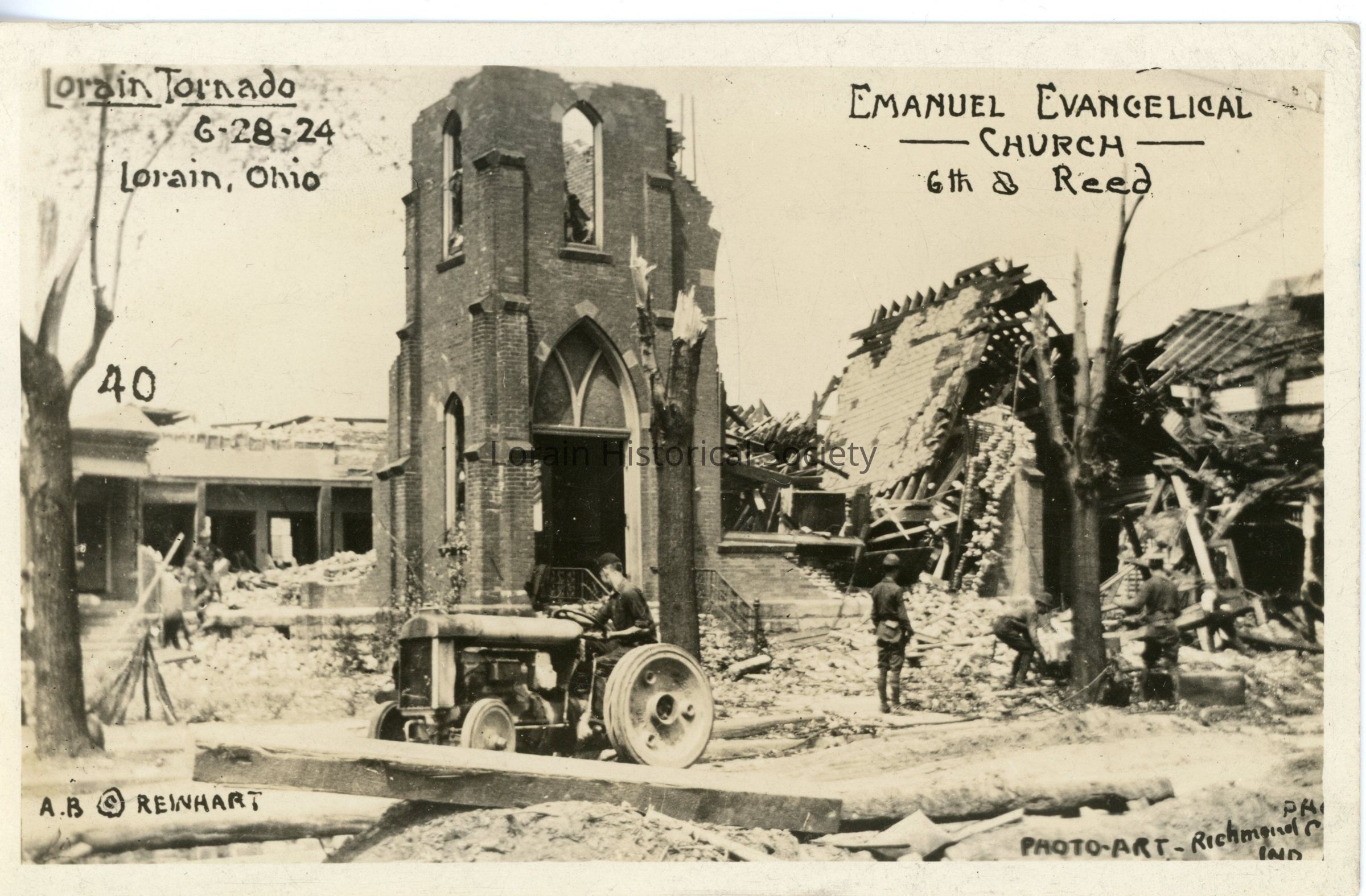 Postcard is view of Emmanual Evangelical Church, Reid Avenue NW Corner of West 6th Street, showing damage from 1924 Tornado. Postcard reads: "Lorain Tornado 6-28-24 Lorain, Ohio EMMANUEL EVANGELICAL CHURCH 6th & Reed #40 A. B. REINHART PHOTO-ART Richmond Ind".Acquisition