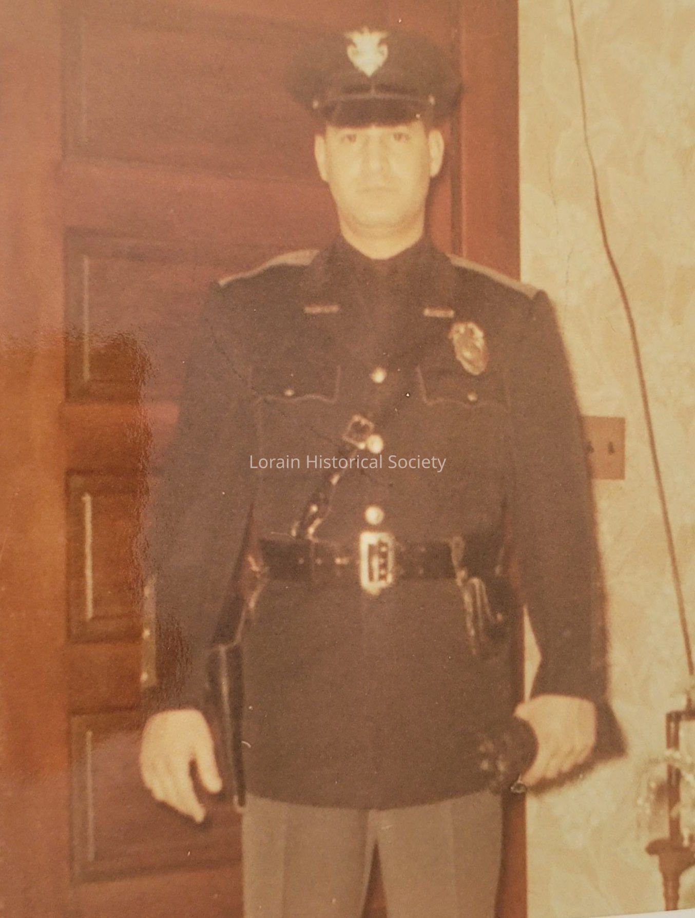 The photo is of Roberto S. Vieta, Sr. Roberto Sr. and his son Robert Jr. were the first father/son police officers in the Lorain Police Department. Photo of a policeman in uniform standing in a room like a living room.Collection