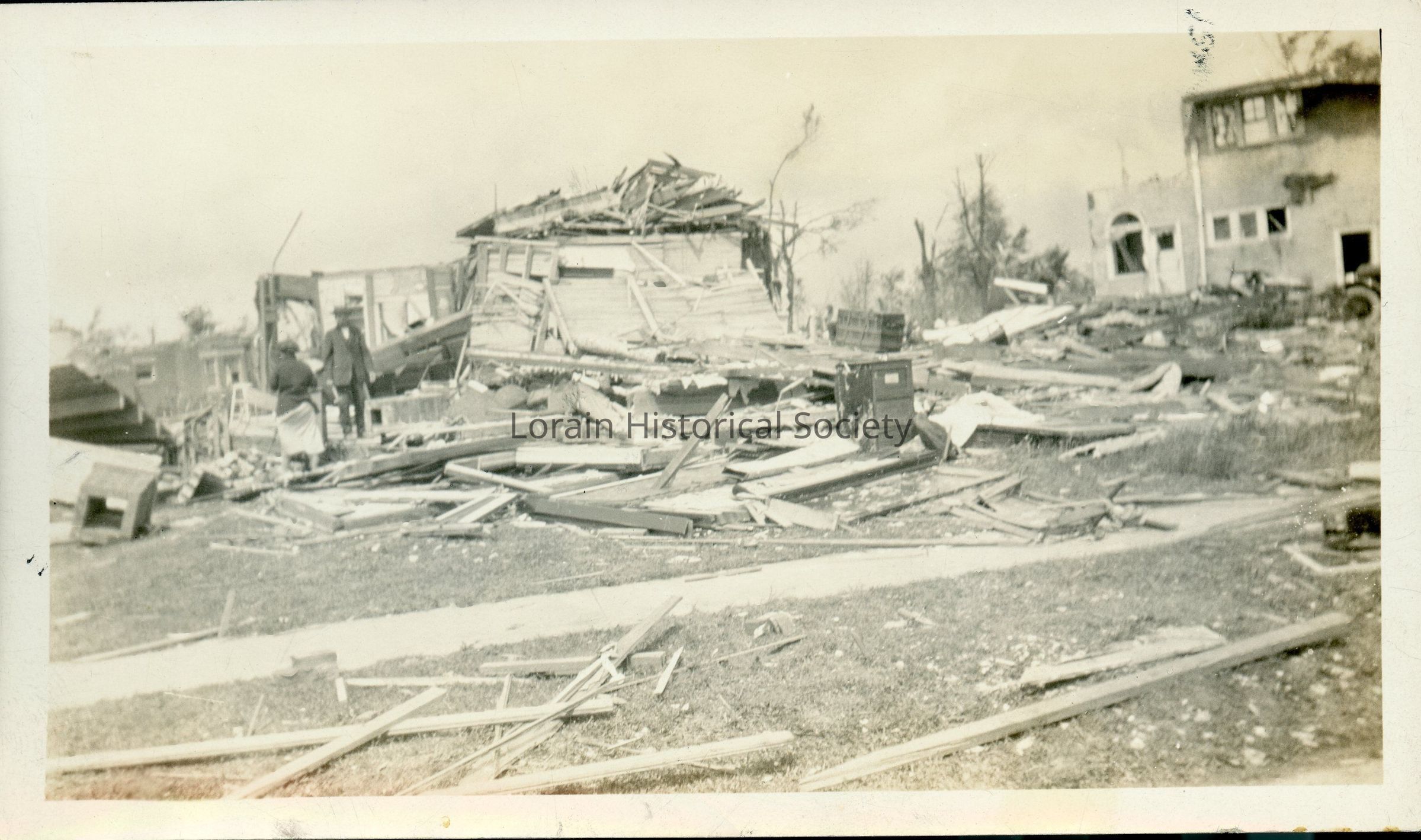 Photograph is black and white view of 1390 South Lakeview Boulevard and 1405 West Erie Avenue showing damage, destruction and debris from 1924 Tornado.