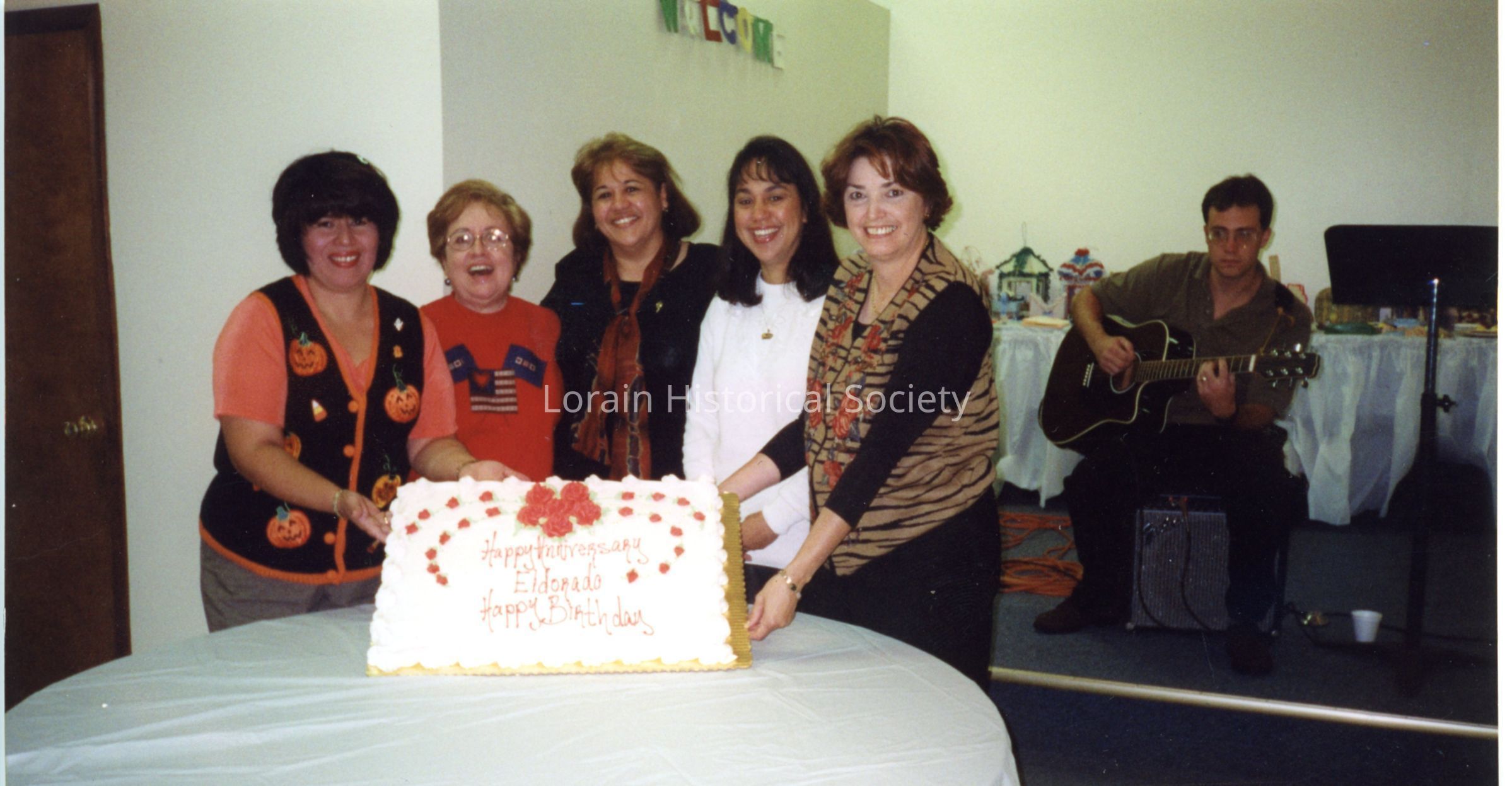 Color 4x7" photo of the community group El Dorado's 75th Anniversary. Women stand with a celebratory cake and someone plays the guitar in the background. The women are left to right: Unknown, Margie Carrion, Louisa Vasquez, Yvonne Llado. Event held at El Centro. Photo was developed 16-Nov-1998.Collection