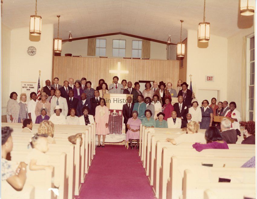 This photo was taken inside Second Baptist Church facing the altar, during the dedication of the Memorial Plaque on Nov 1, 1981. Parishioners are sitting in pews, a man is speaking at the podium with folks standing and sitting around him at the altar. The plaque in the center of the photo at the alter is a memorial plaque. When someone passed from the Church their names would be added to the plaque in memorial. Reverend Banks is standing on the top row, 3rd from left. Mr. Allen is standing on the top row, far left. Ms. Huff is standing on the top row 6th from the right.Collection