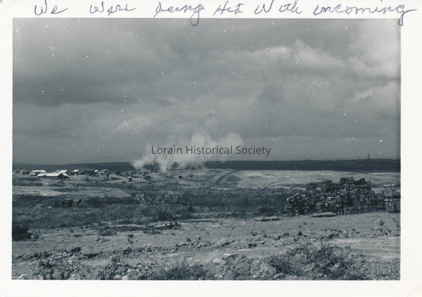 Photo of incoming fire and labeled "We were being hit with incoming" fire. Photo taken in Don Ja, South Vietnam during the Vietnam War. Photo is from the collection of Jose Rodriguez from his time in the U.S. Army. Photo of an open field with piles of equipment and smoke in the distance.Collection