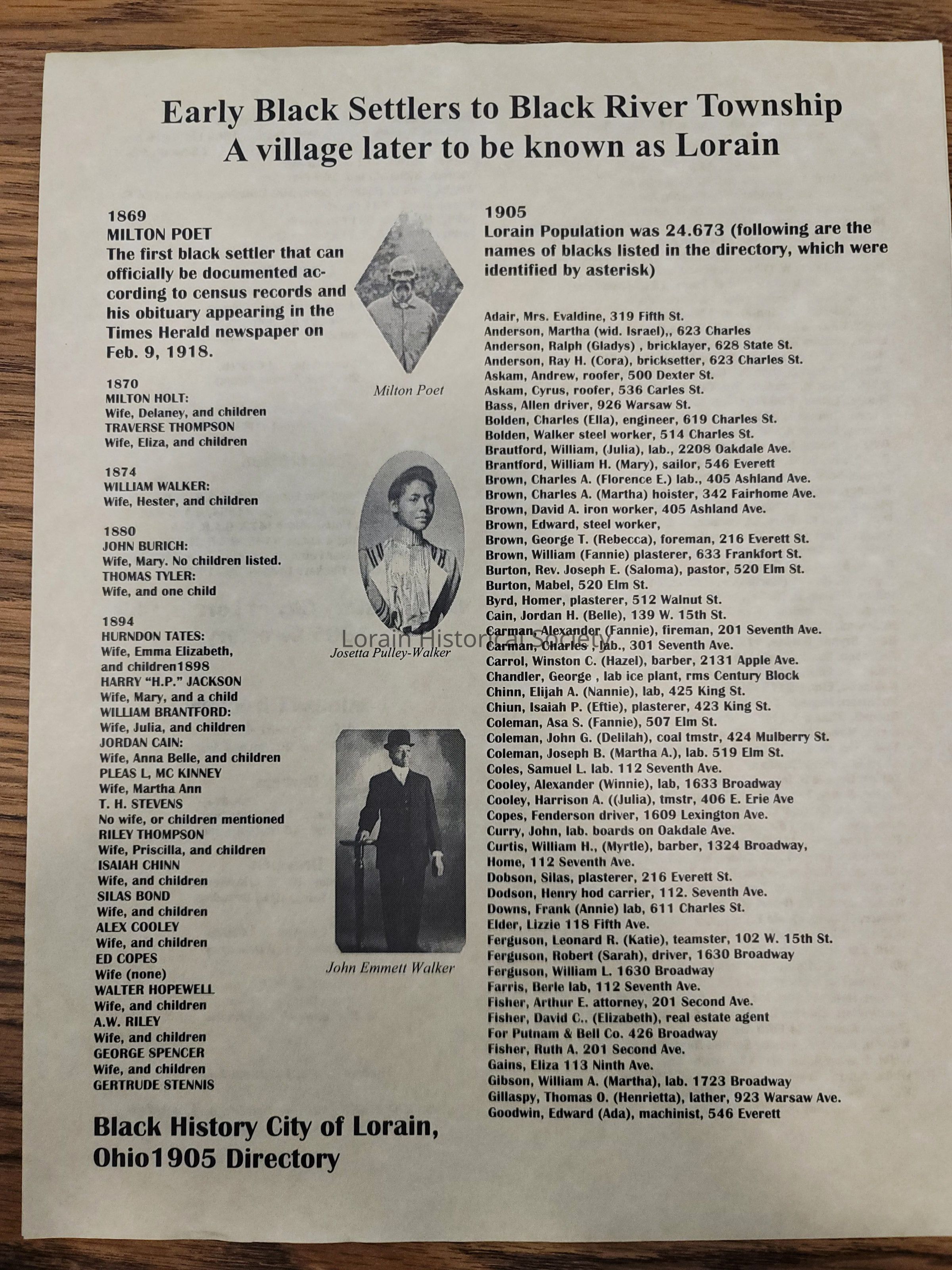 Includes list of families in Lorain by year 1869 (Milton Poet - includes photo); 1870, 1874, 1880, 1894. And list of black families taken from the 1905 City Directory (which were identified by asterisk). Also lists churches, societies, business directory listings.