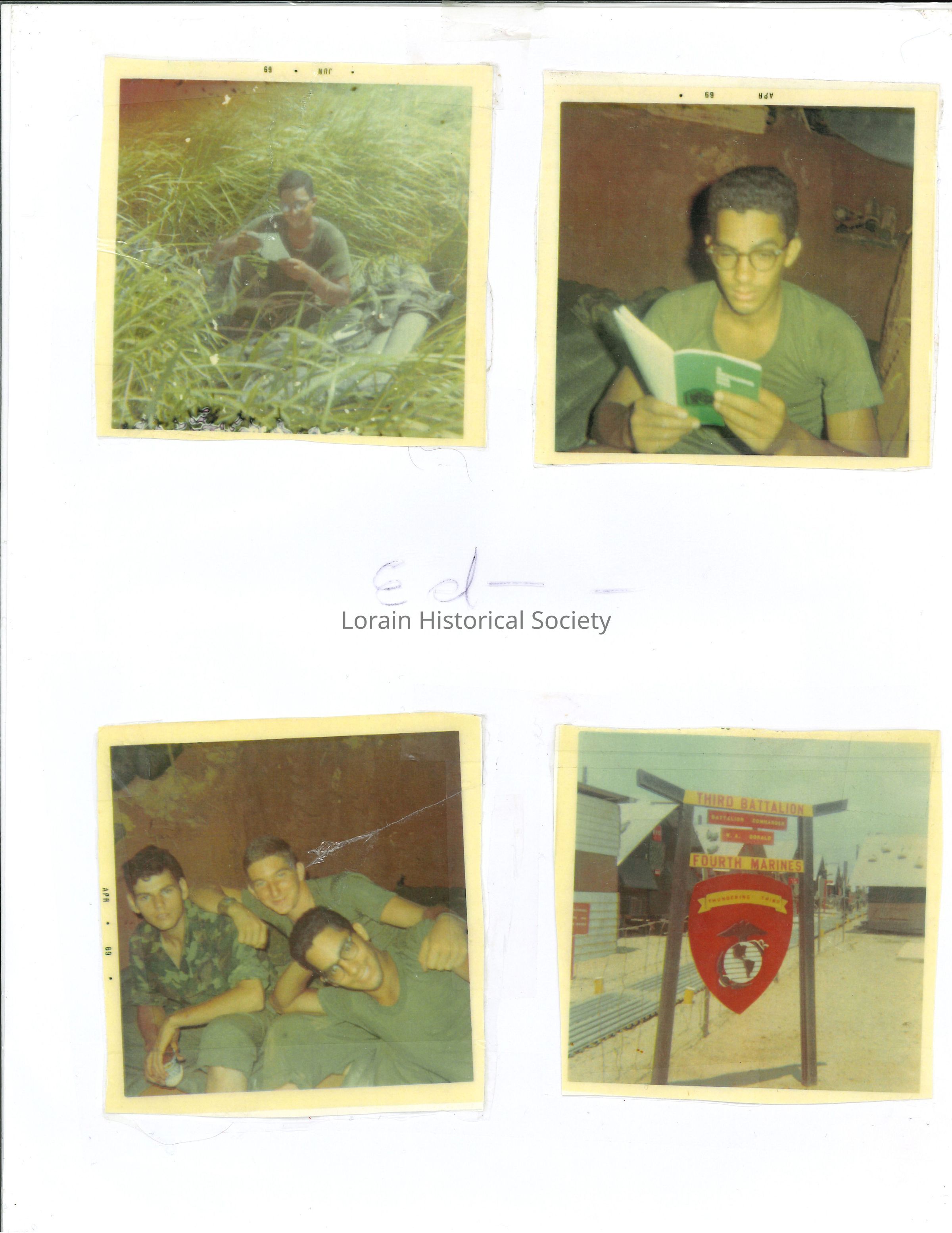 Four photos related to Eddie Corsino's military service in Vietnam. Eddie is pictured in three of the photos. Eddie served in the U.S. Marine Corps during the Vietnam War. He specifically served with Company I, 3rd Battalion, 4th Marines, 3rd Marine Division (Rein.), FMF and held the rank of Lance Corporal. He enlisted in 1968 and was killed in action on September 17, 1969. Eddie was one of the first Lorainites to lose his life in the Vietnam War.Collection