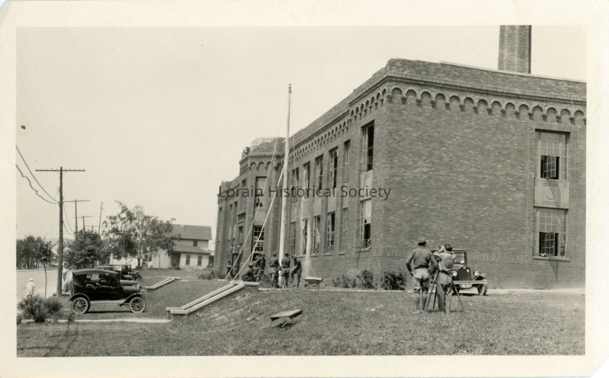 Photograph is black and white view of Irving Elementary and Junior High School, West Fourth Street and Hamilton Avenue, showing damage (broken windows) after clean up from 1924 Tornado. Unidentified National Guardsmen are raising the flag and two unidentified surveyors are in right foreground.Photograph Details