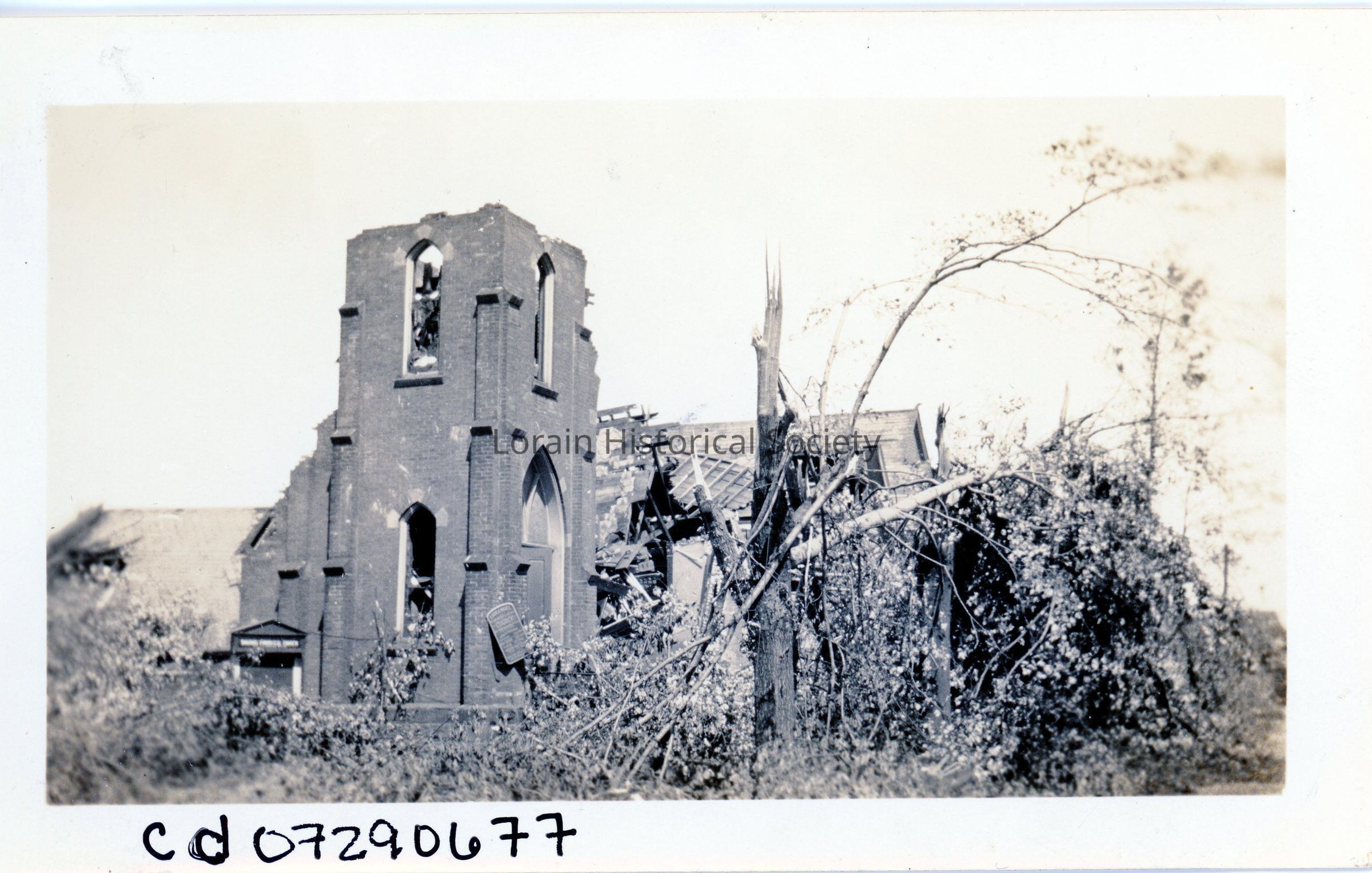 Photograph is black and white view of Emmanual Evangelical Church, 300 West Sixth Street, showing damage and destruction from 1924 Tornado.Acquisition