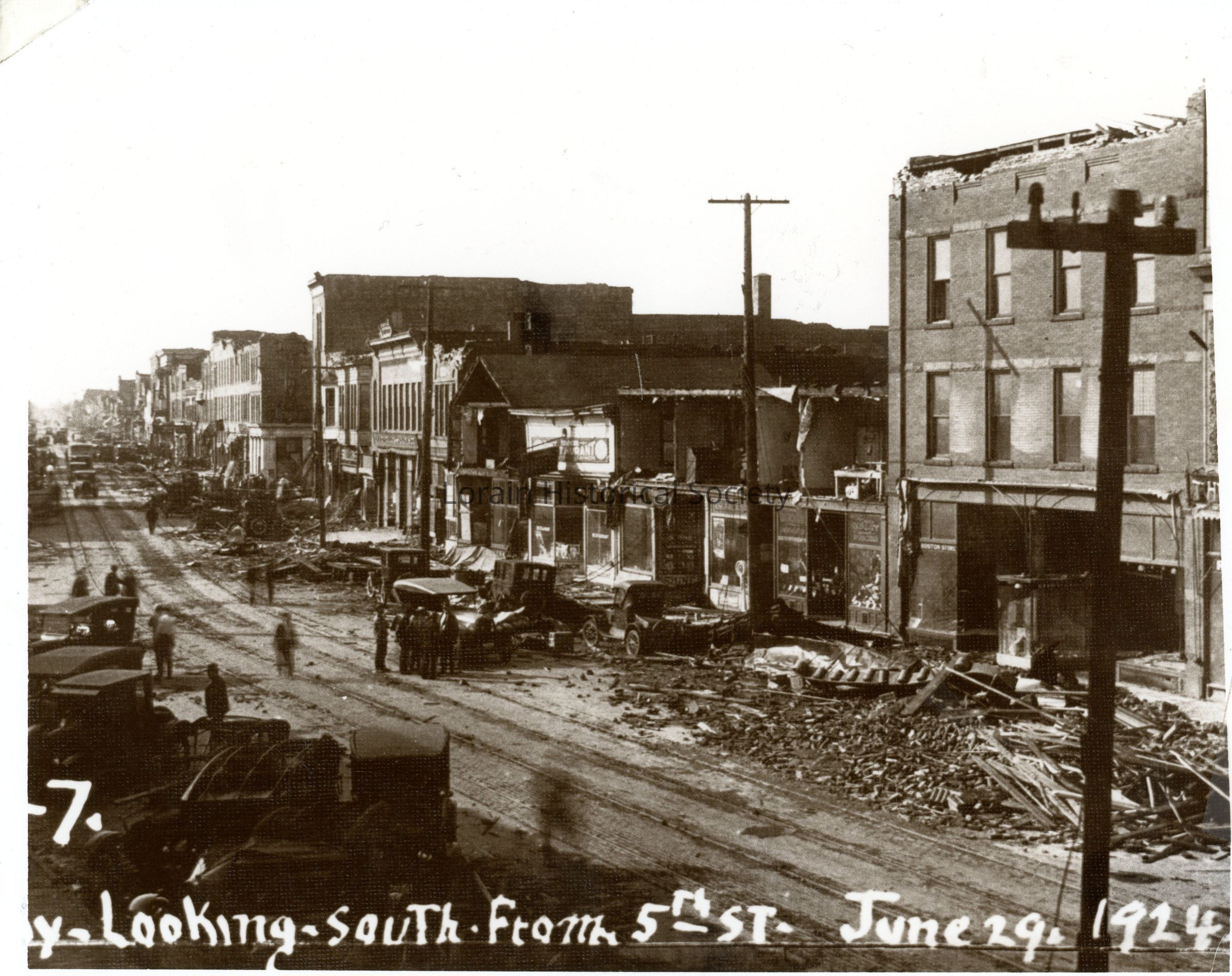 Photograph is black and white copy of Postcard #7 "Bdwy Looking South From 5th St - June 29, 1924". It shows west side of Broadway looking south from West Fifth Street showing damage and destruction from 1924 Tornado.Acquisition