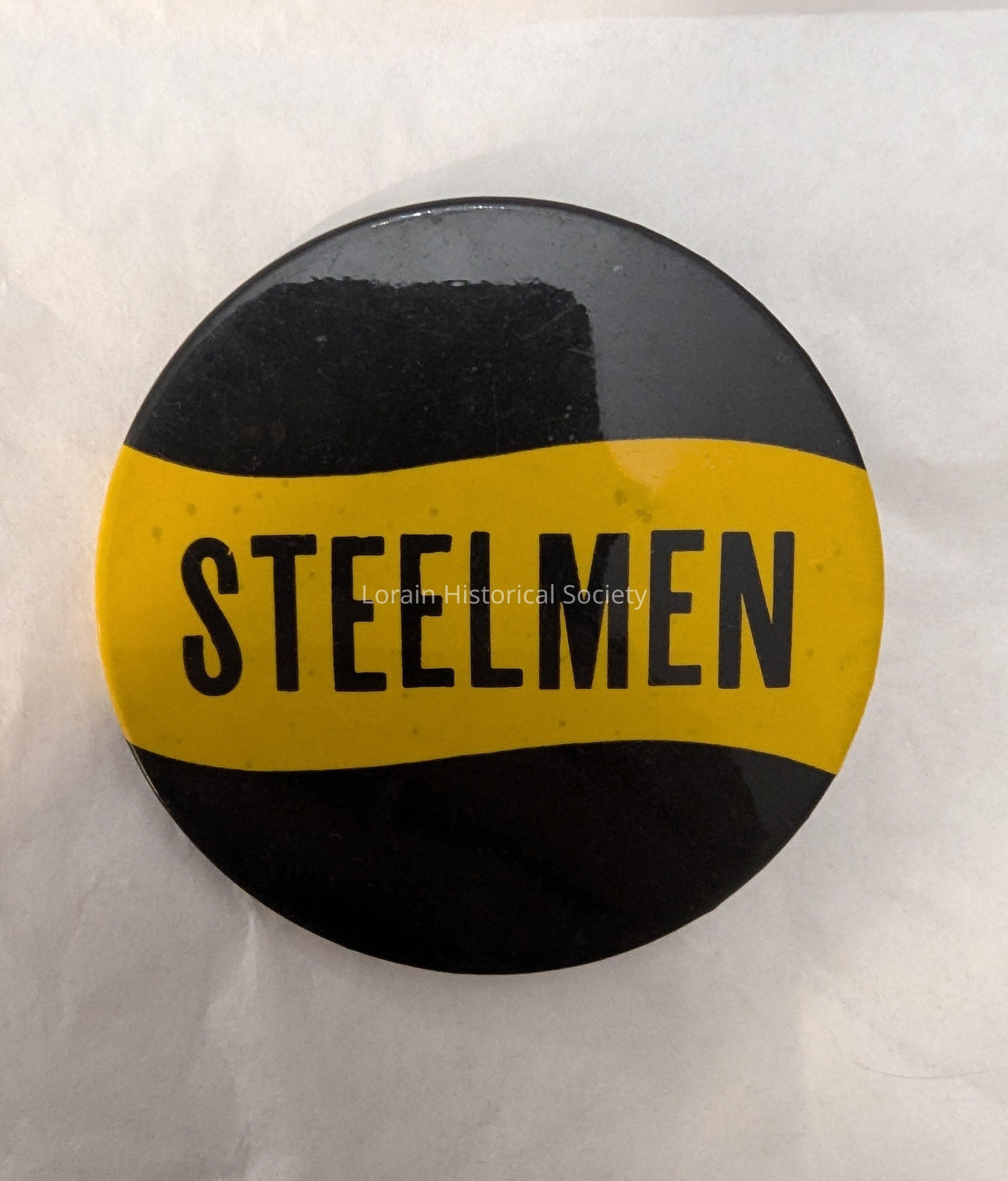LHS Steelmen badge/pin. School colors of black and gold. (There are 2 pins, same ID)