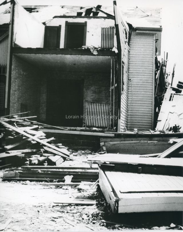 Photograph is black and white view of unidentified house showing damage, destruction and debris from 1924 Tornado. Back wall of house is missing and roof is missing above second floor.Acquisition