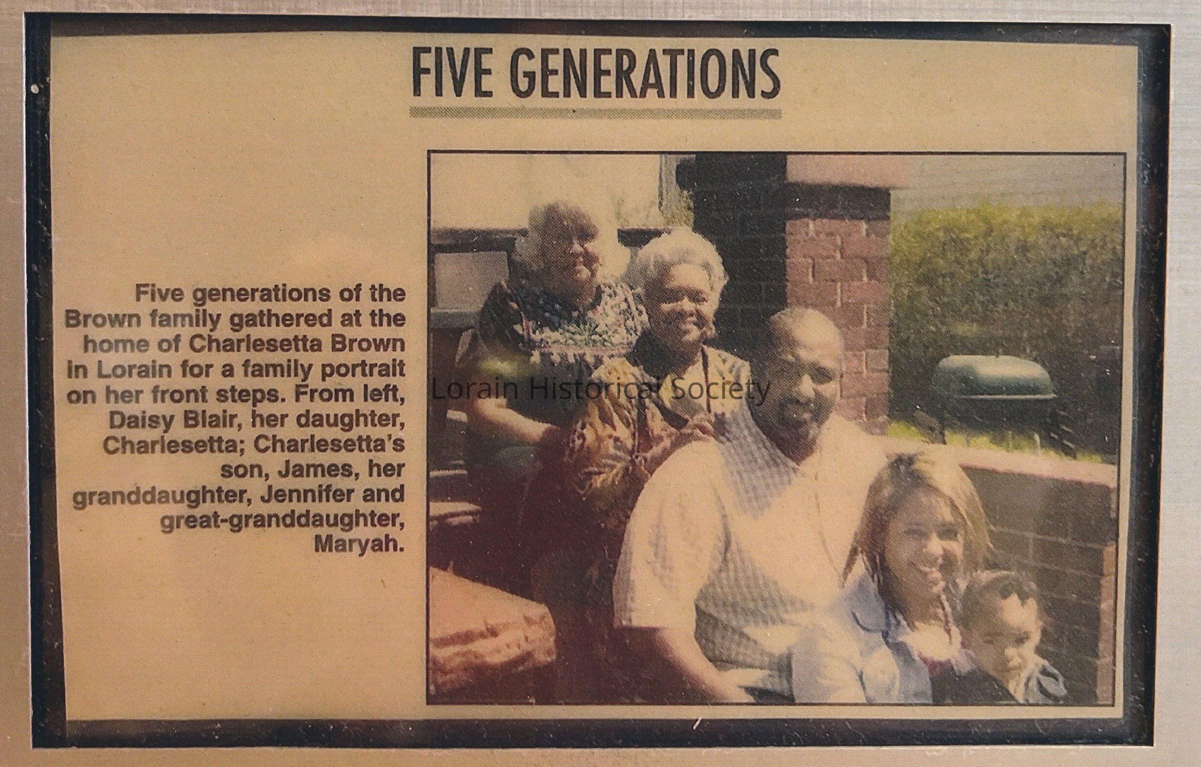 "Five Generations of the Brown family gathered at the home of Charlesetta Brown in Lorain for a family portrait on her front steps. From left, Daisy Blair, her daughter, Charlesetta; Charlesetta's son, James, her granddaughter, Jennifer and great granddaughter, Maryah."Collection