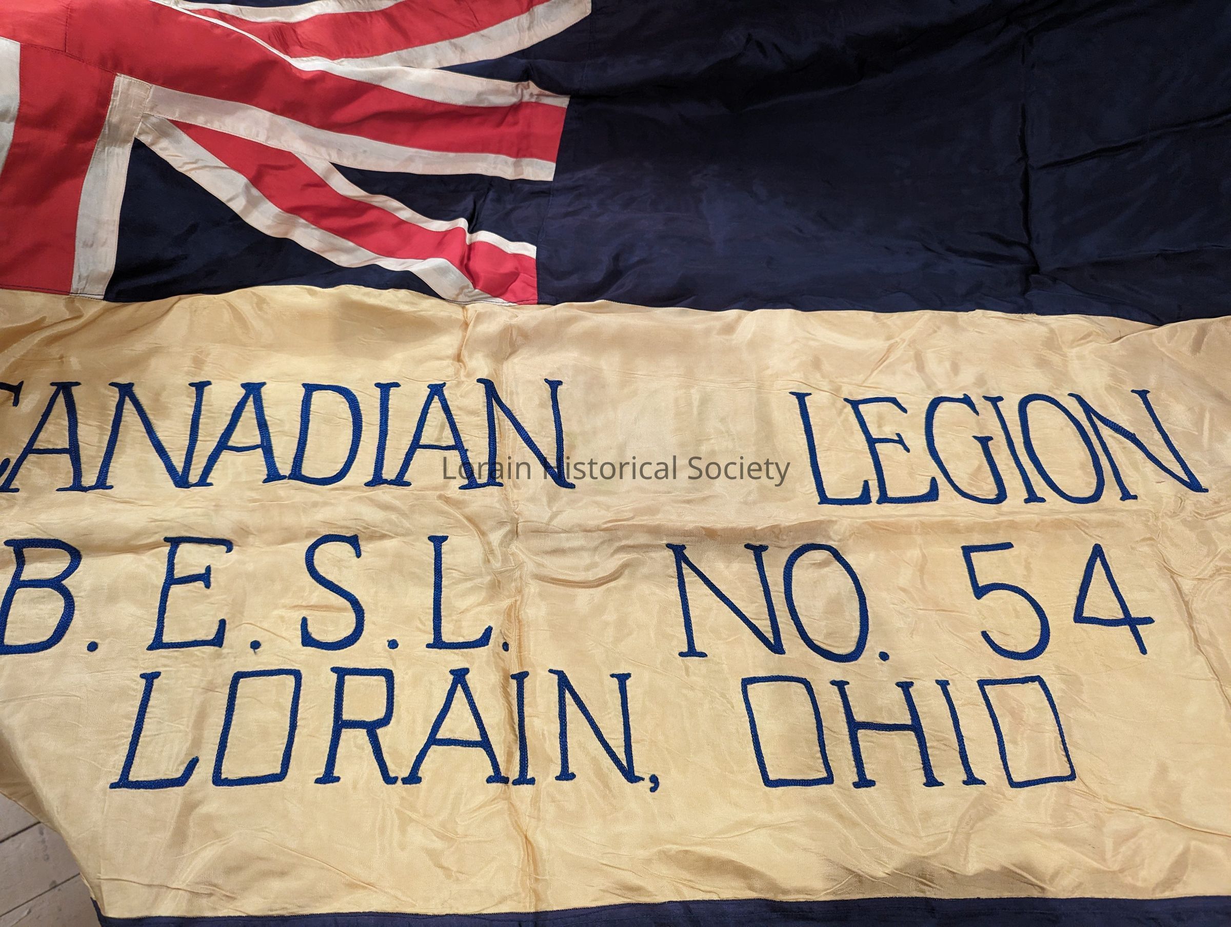 Large flag Canadian Legion B.E.S.L. No. 54, Lorain, OH -Navy blue, red, yellow with gold fringe