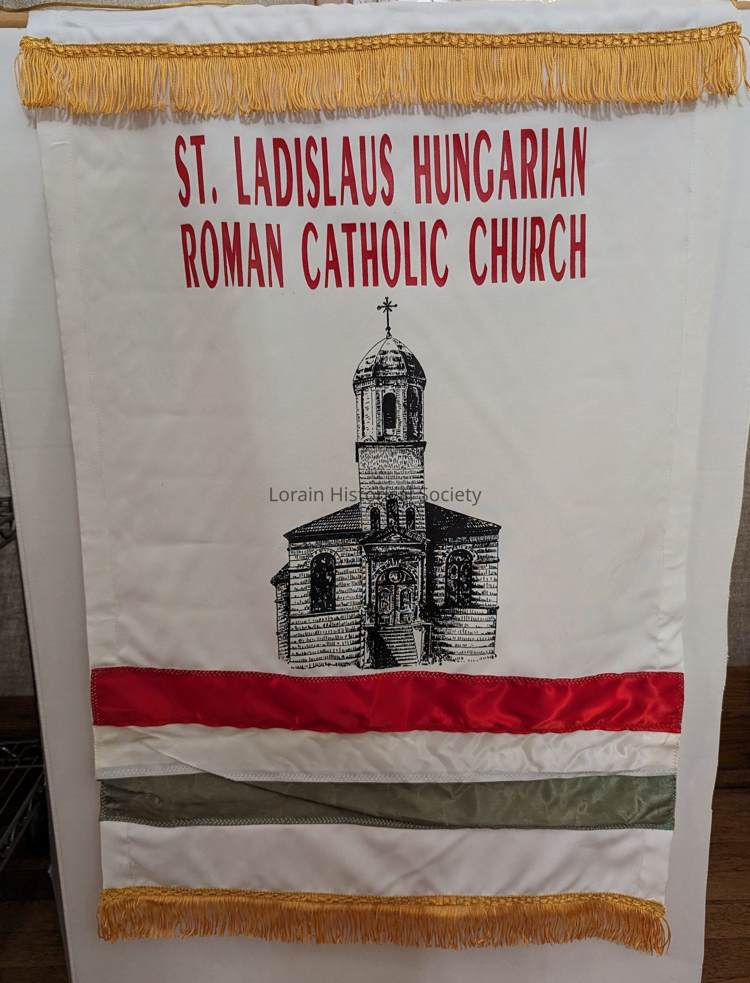 St. Ladislaus Hungarian Roman Catholic Church flag; white with Hungarian flag stripes, black graphics of the church building, and gold fringe on the top and bottom; wooden dowel in the top to hang vertically;Collection