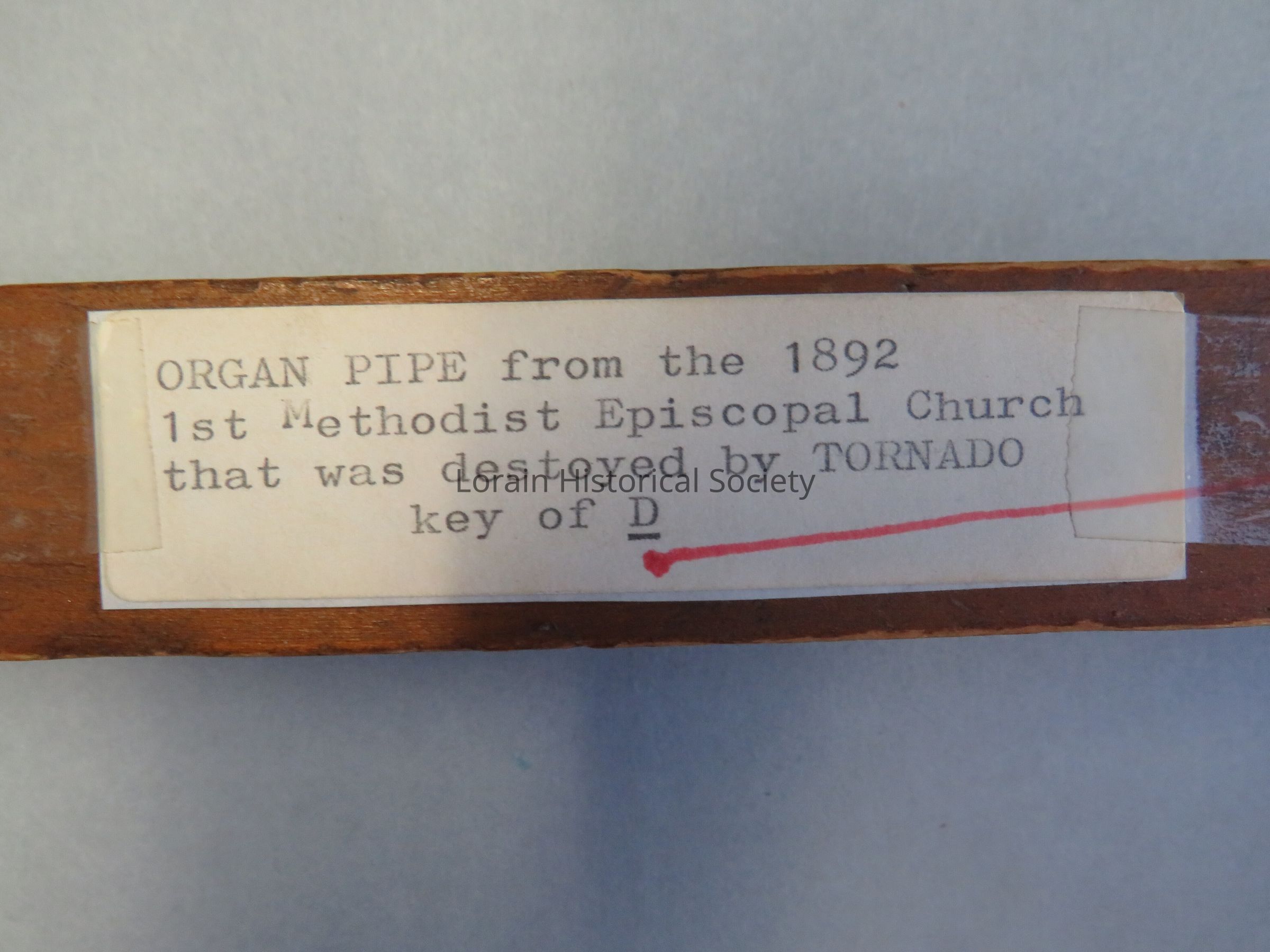 A wooden organ pipe, c. 1890 in the key of D. This pipe belonged to the organ used in the 1st Methodist Episcopal Church, 6th St. and Reid Ave., Lorain, Ohio. The church was destroyed in the tornado that touched down in 1924 and destroyed most of downtown Lorain.Acquisition
