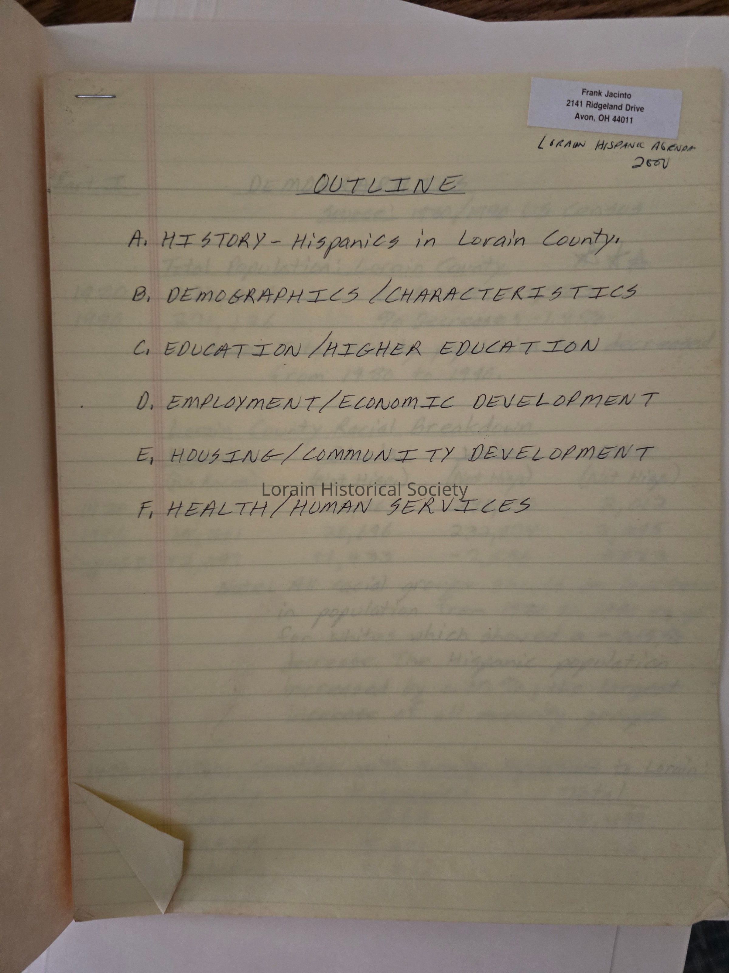 - Handwritten notes, "Lorain Hispanic Agenda Outline" 2001(?)