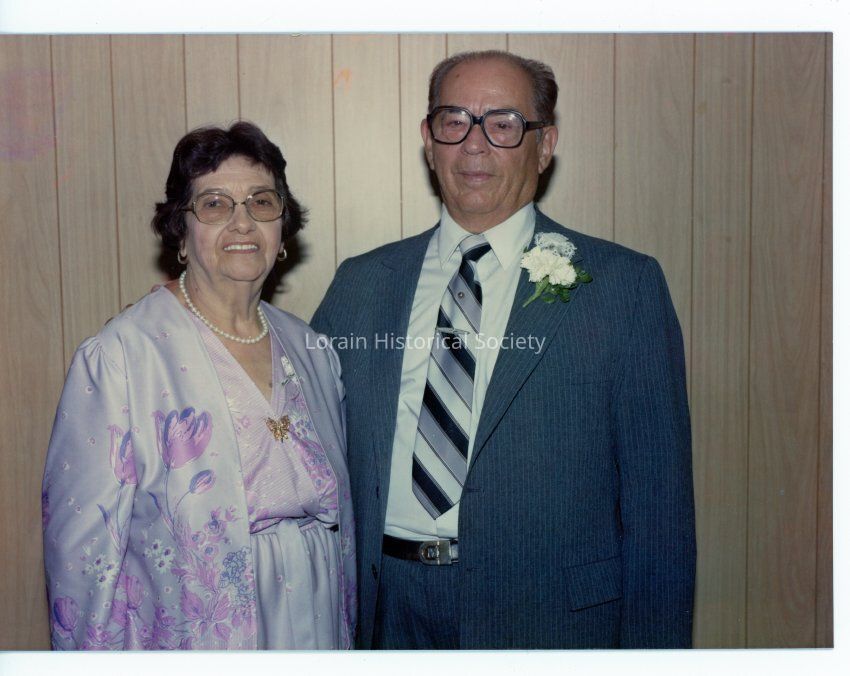 Gervasio and Aurelia Munoz. Aurelia is wearing a light purple, floral blouse and outfit. Gervasio is wearing a blue suit and tie and has a bouteneer.Collection