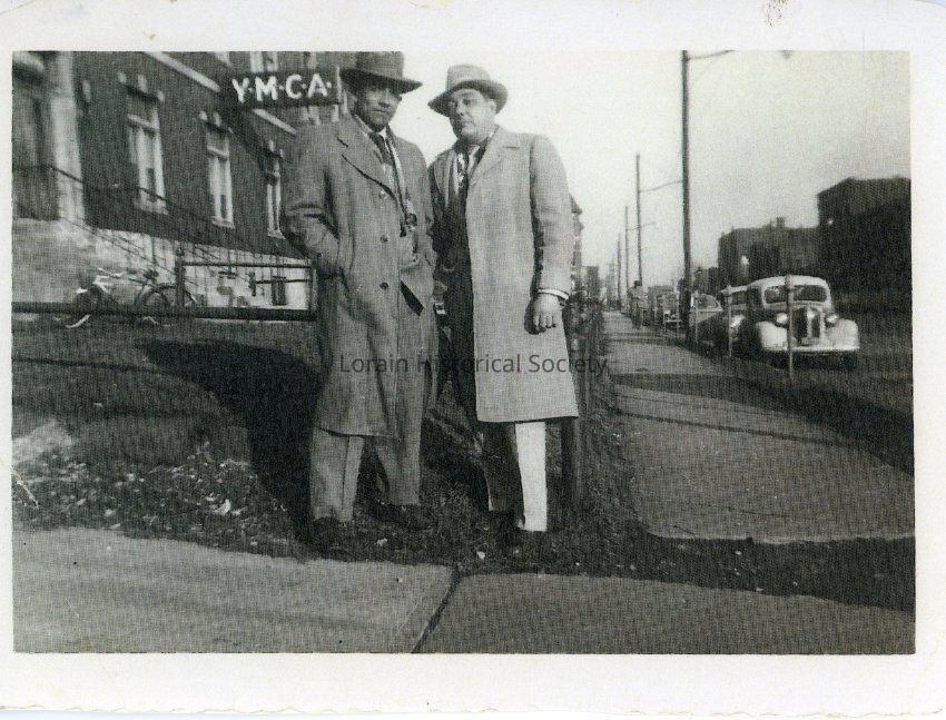 Sonia Charles' father, Guillermo Quinones and friend Juan Figueroa. Standing in beside the YMCA on 29th Street. Men are wearing fedoras and trench coats.1940s?Collection