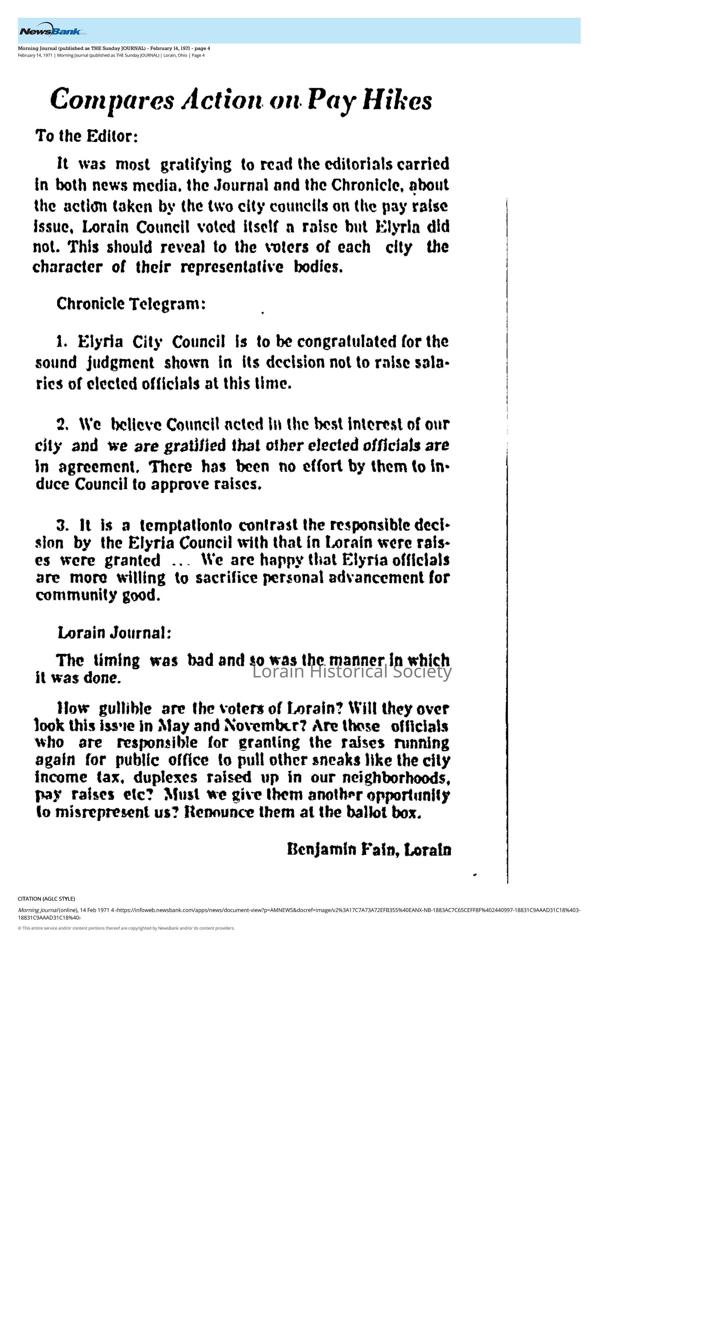 In this opinion editorial, written by Mr. Hamzah and printed in the Feb 14, 1971 issue of the Lorain Journal, he criticizes the Lorain City Council for voting to give themselves raises.Collection