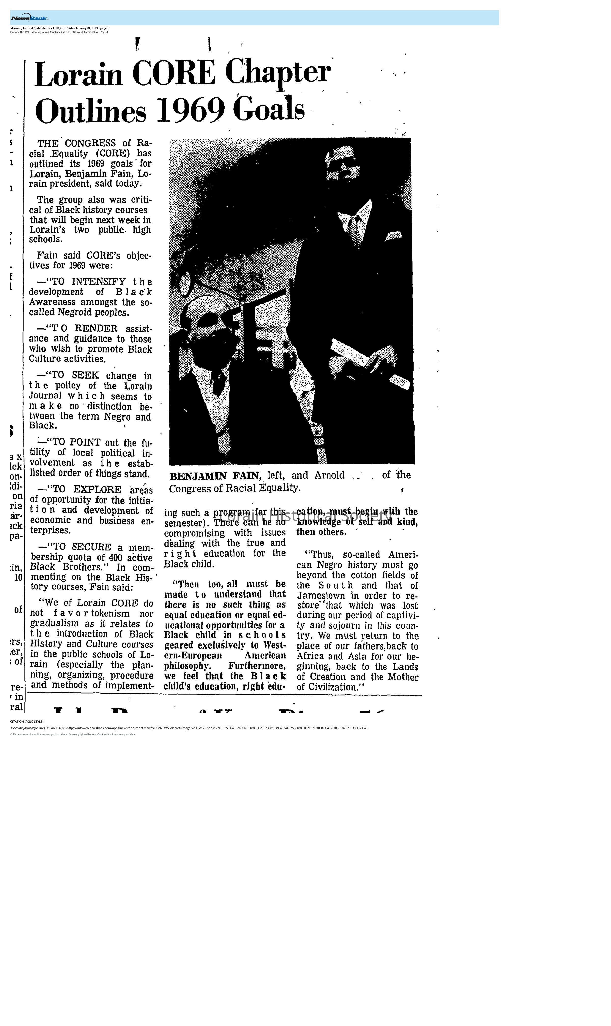 This article, printed in the Lorain Journal on Jan 31, 1969, discusses the goals of Lorain's chapter of the Congress of Racial Equity (aka CORE), of which Mr. Hamzah was President.Collection