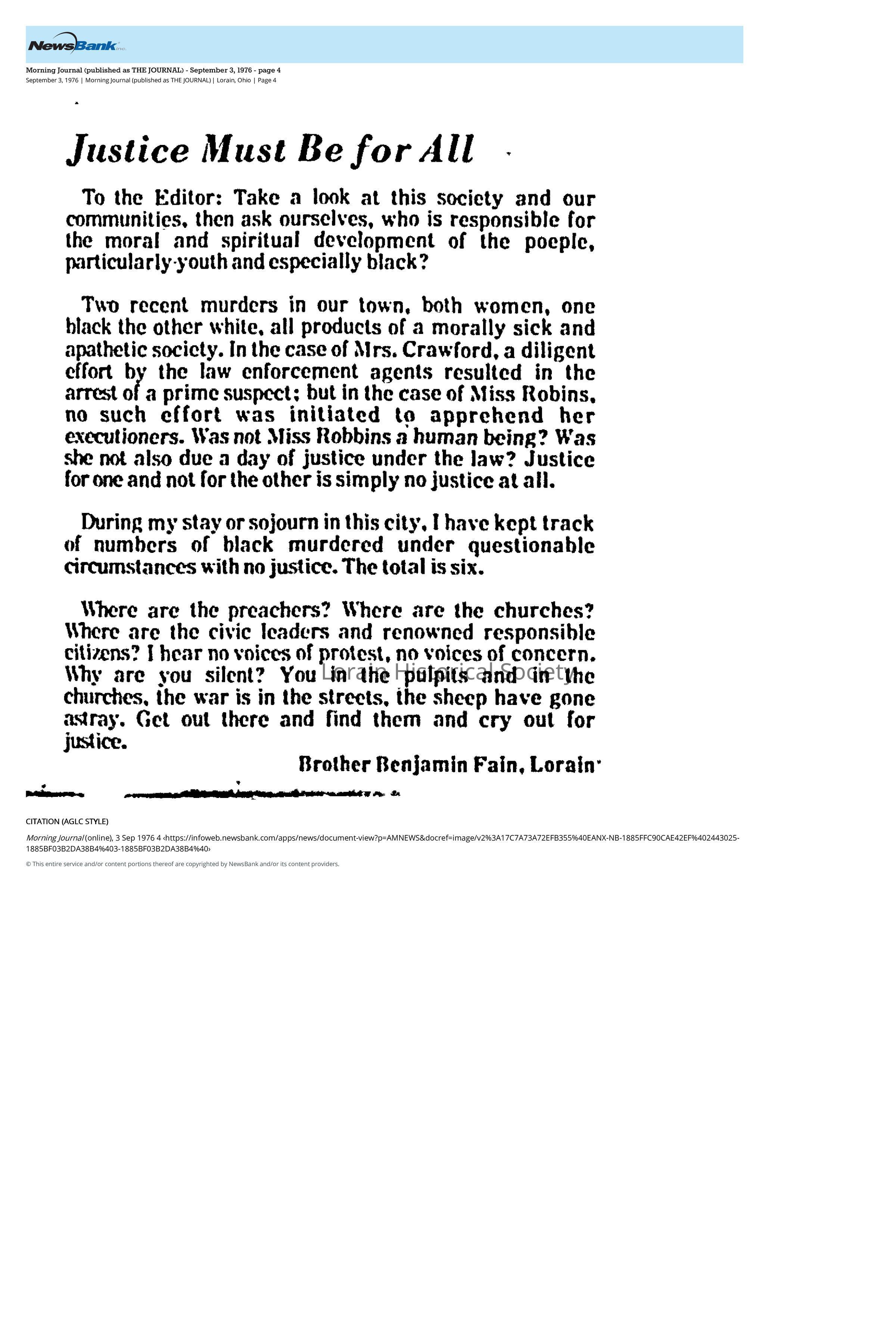 In this opinion editorial written by Mr. Hamzah and published in the Lorain Journal on Sep 3, 1975, he discusses racial disparity in the way murders are treated by law enforcement, and encourages churches and civic leaders to get involved.