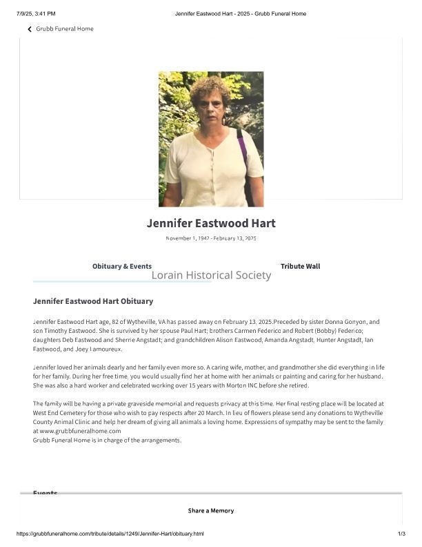 Hart, Jennifer Eastwood obitScope and Content