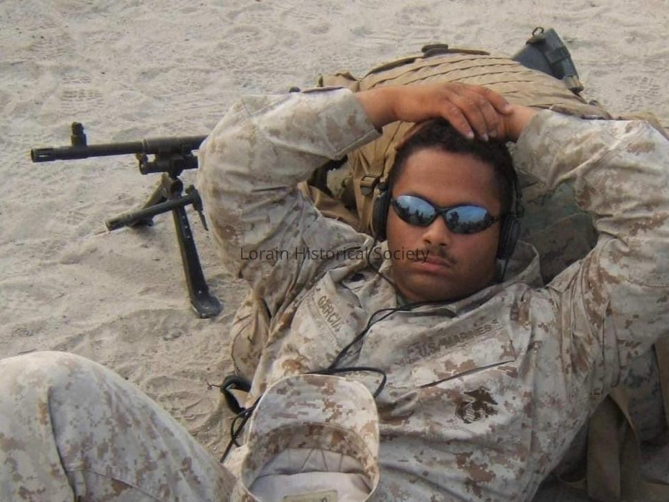 Photo of Hector Garcia in Iraq in February 2008. He is lying on his own pack with his weapons in the background. They were an M240 G (gulf) and an M16-A2 service rifle. Hector was about to return home to the U.S. from his deployment. Hector served in the U.S. Marine Corps.Collection