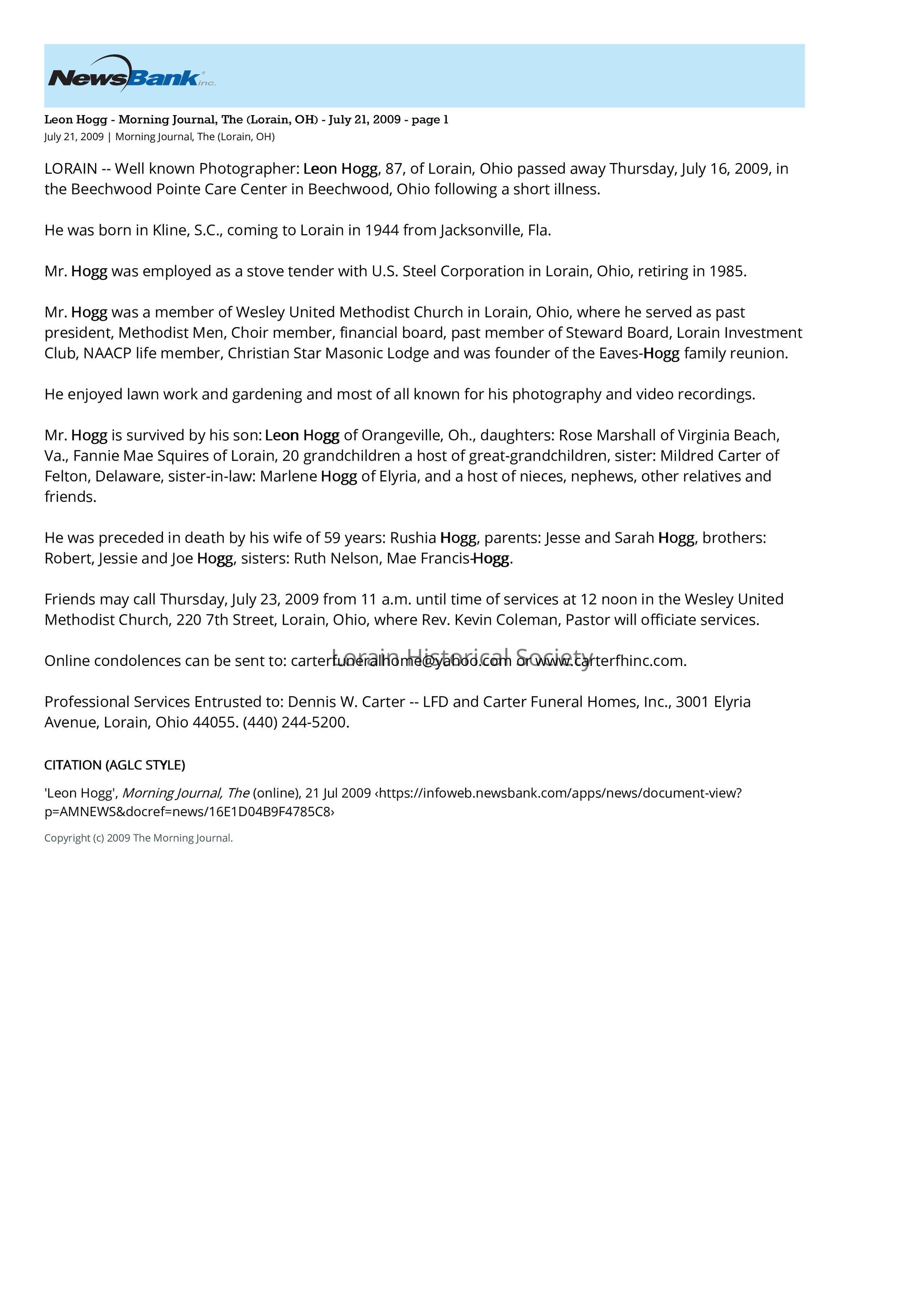 Obituary of Leon Hogg, Community Photographer. Printed in the Lorain Morning Journal on July 21, 2009. Mr. Hogg passed away following a short illness on July 16, 2009.