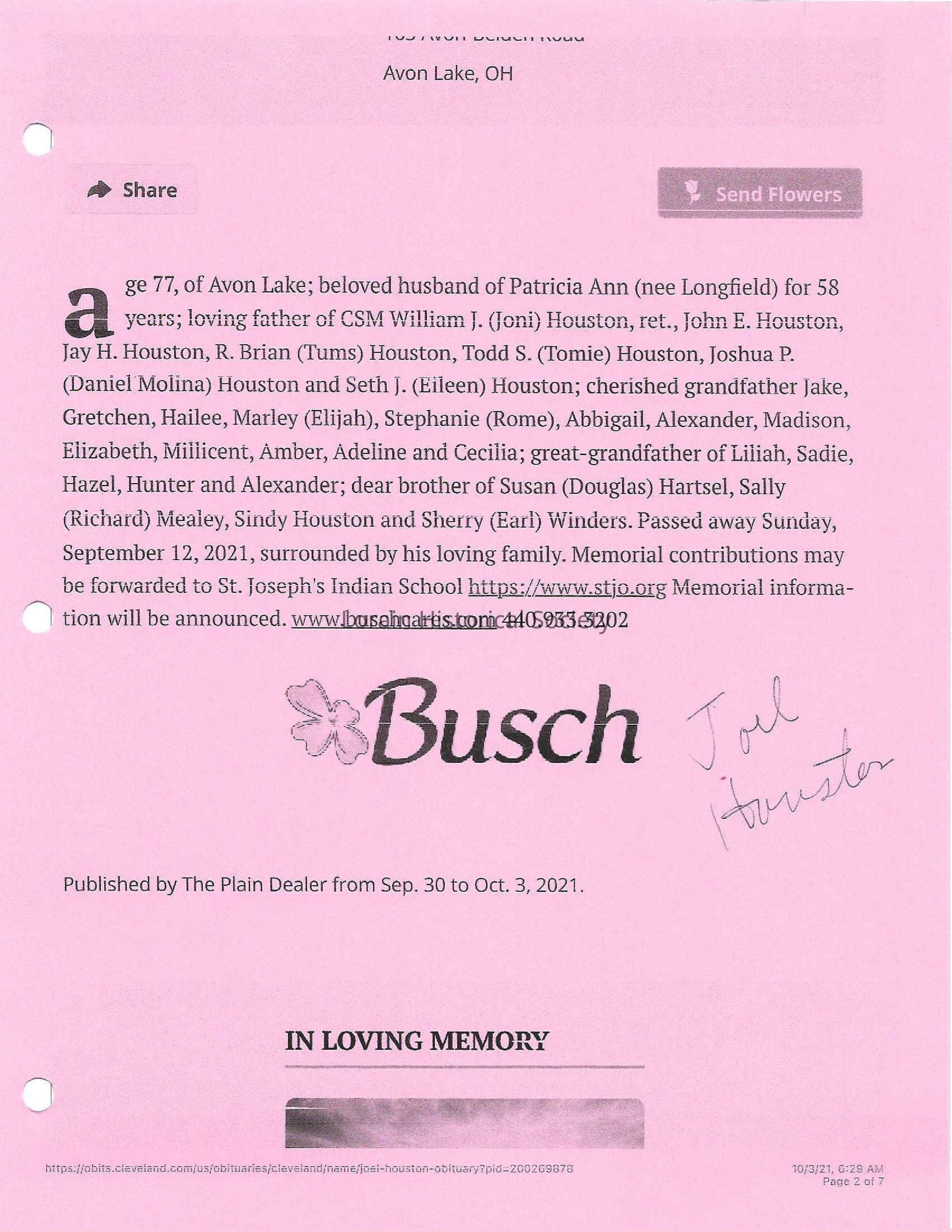 Houston, Joel obit