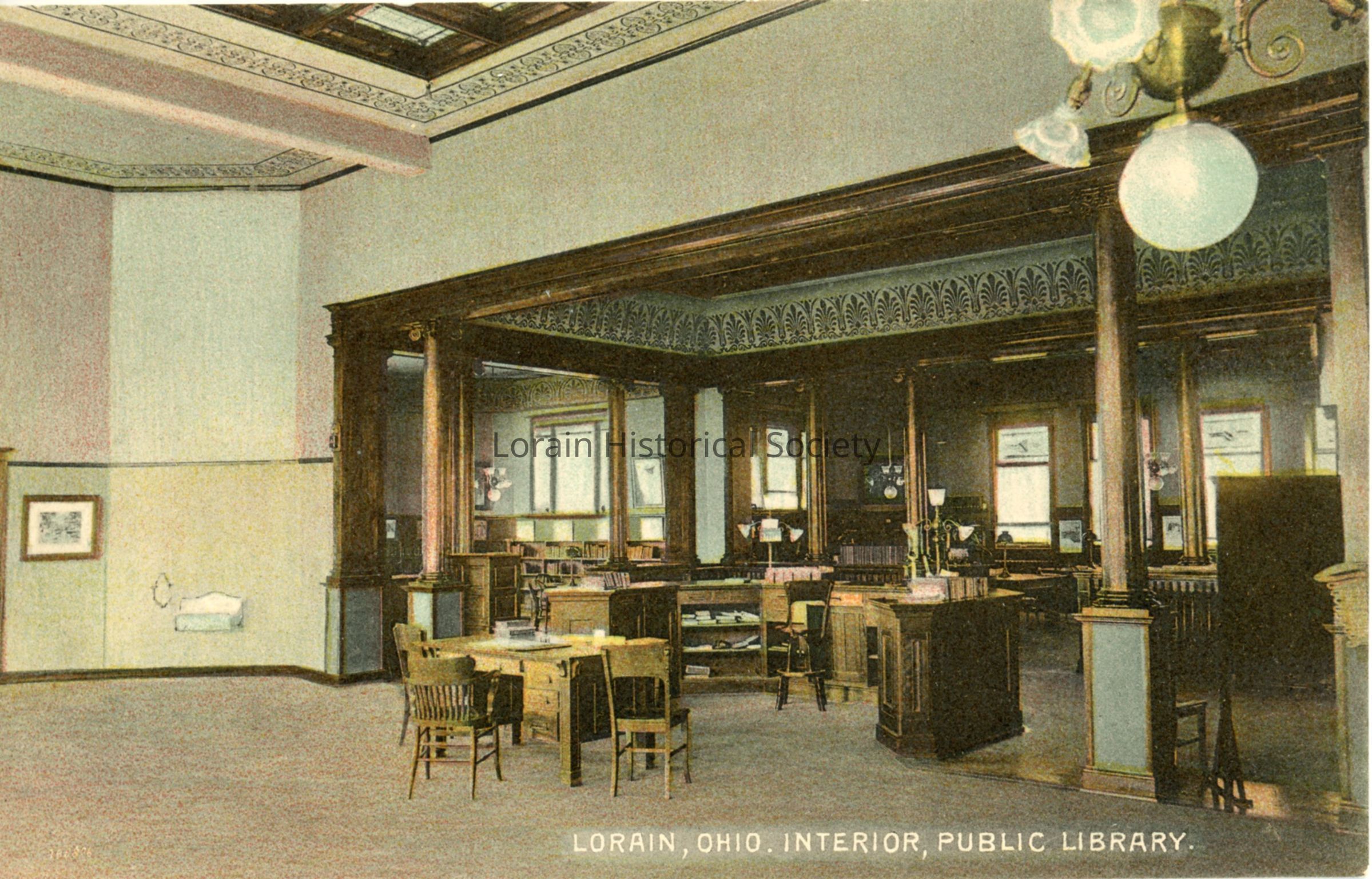 10/10/2022 AMS: Color postcard is view of the interior of the Lorain Public Library (Carnegie). Postcard reads: "Lorain, Ohio Interior, Public Library".