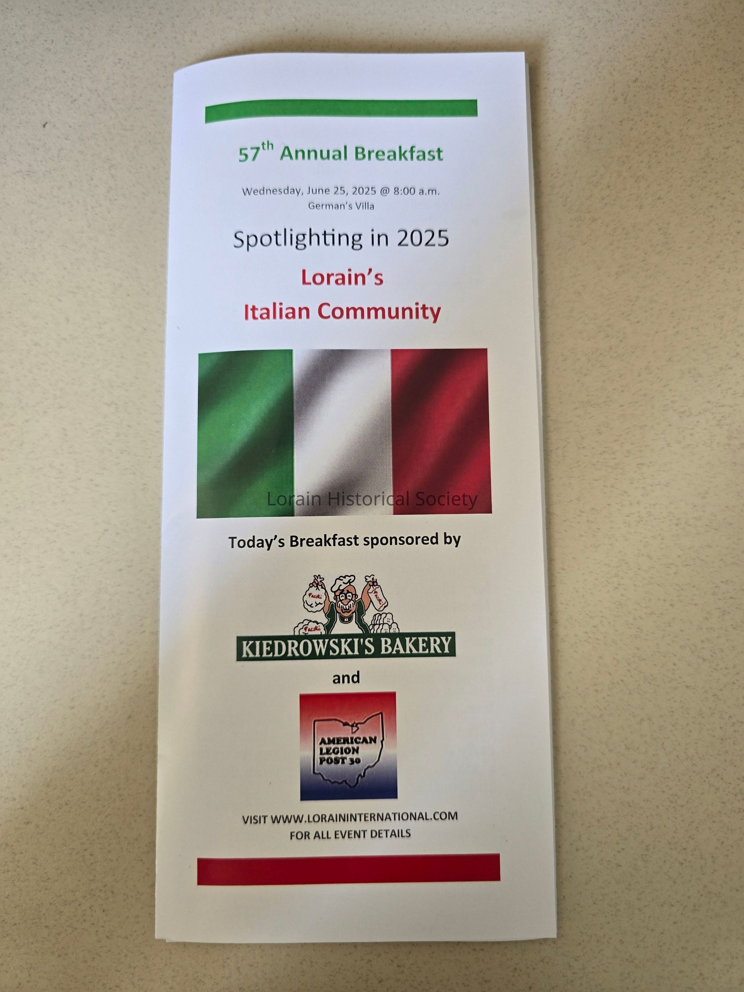 57th Annual Breakfast program from the Lorain International Festival, spotlighting Lorain's Italian Community. Inside includes historical narrative on Lorain's Montenero Society of Lorain and guest speaker Joseph Delmonico.Acquisition