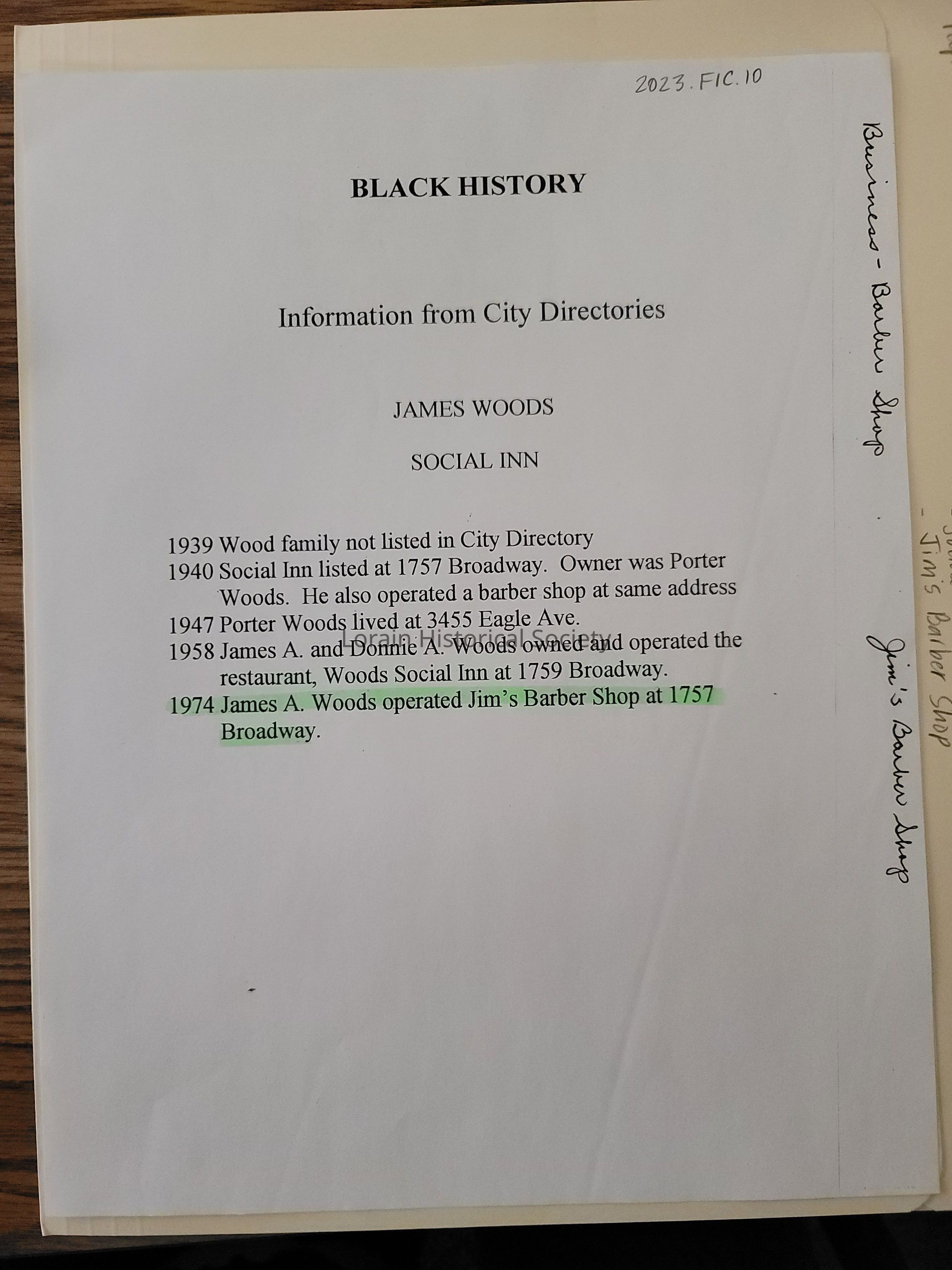 One page informational sheet with details from City Directories regarding James Woods Social Inn. The Social Inn was first listed in 1940 at 1757 Broadway and owned by Porter Woods. He also operated a barber shop at this same address.