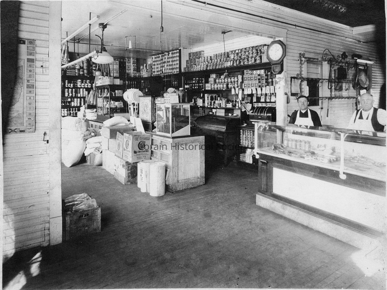 John Rebman's Meat Market on 2919 Grove Avenue. Two men behind counter.
