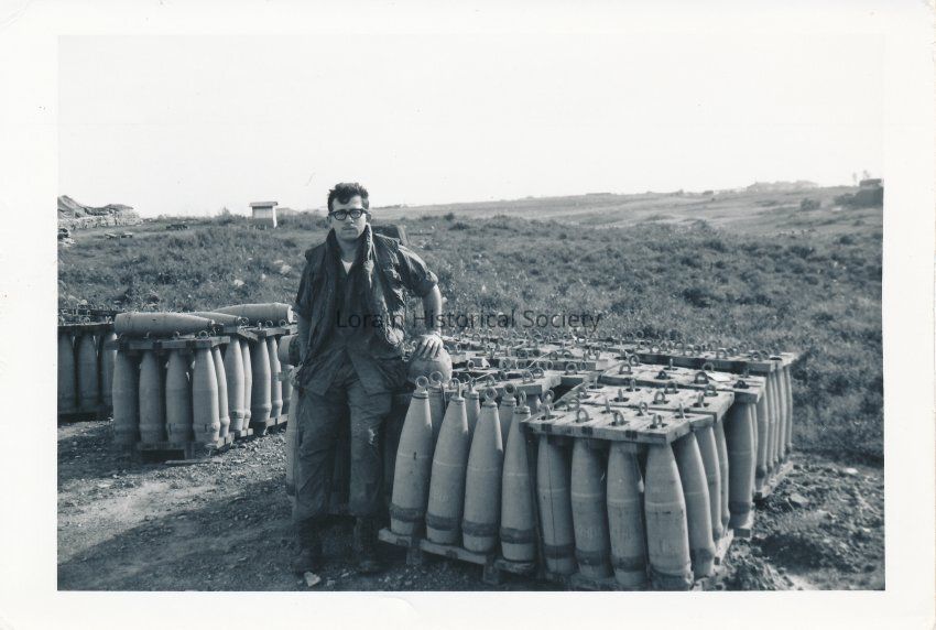 Jose Rodriguez standing in front of artillery rounds (10S Rounds) in South Vietnam for the Vietnam War while in the U.S. Army.Collection