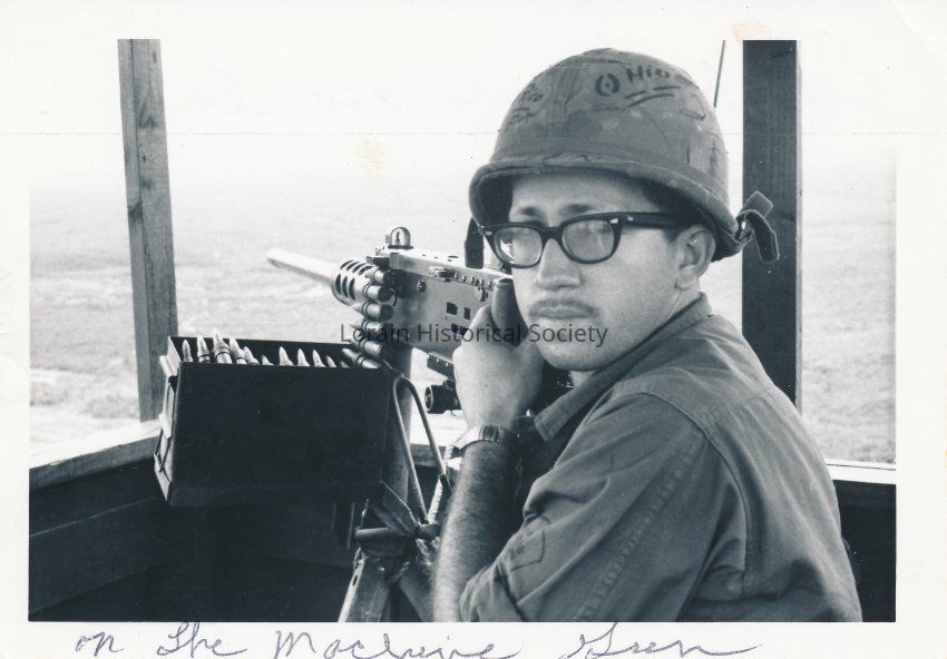 Jose Rodriguez on a machine gun while in South Vietnam during the Vietnam War while in the U.S. Army. He is wearing a helmet with Ohio printed on the side. Photo labeled "On the Machine Green." He looks at the camera and appears to be in a tower with land out in the distance behind him.Collection