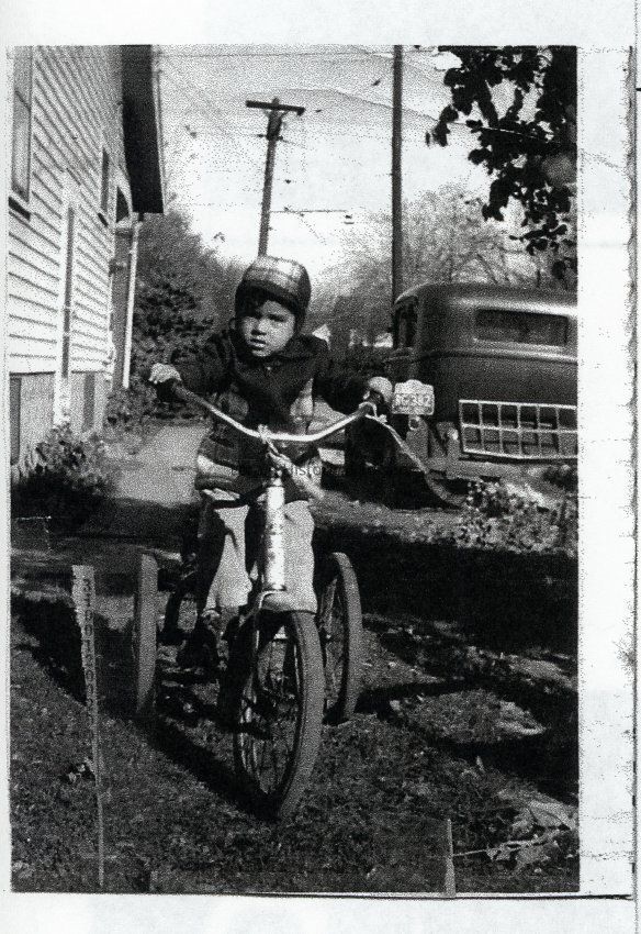 DeJesus family photograph: June "DJ" DeJesus, young boy rides a three wheeled bicycle. He is between a house and a vehicle. A telephone pole is in the background. He wears a plaid hat and jacket.Collection