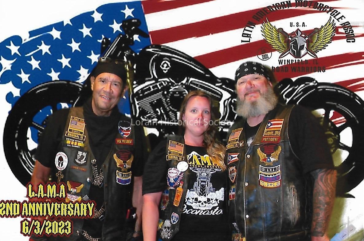 Photo of Antonio Barrios (left) and two members of the Lorain chapter of the Latin American Motorcycle Association (L.A.M.A.) at an anniversary party on June 3, 2023. The party was hosted by the Winfield L.A.M.A. chapter.Collection