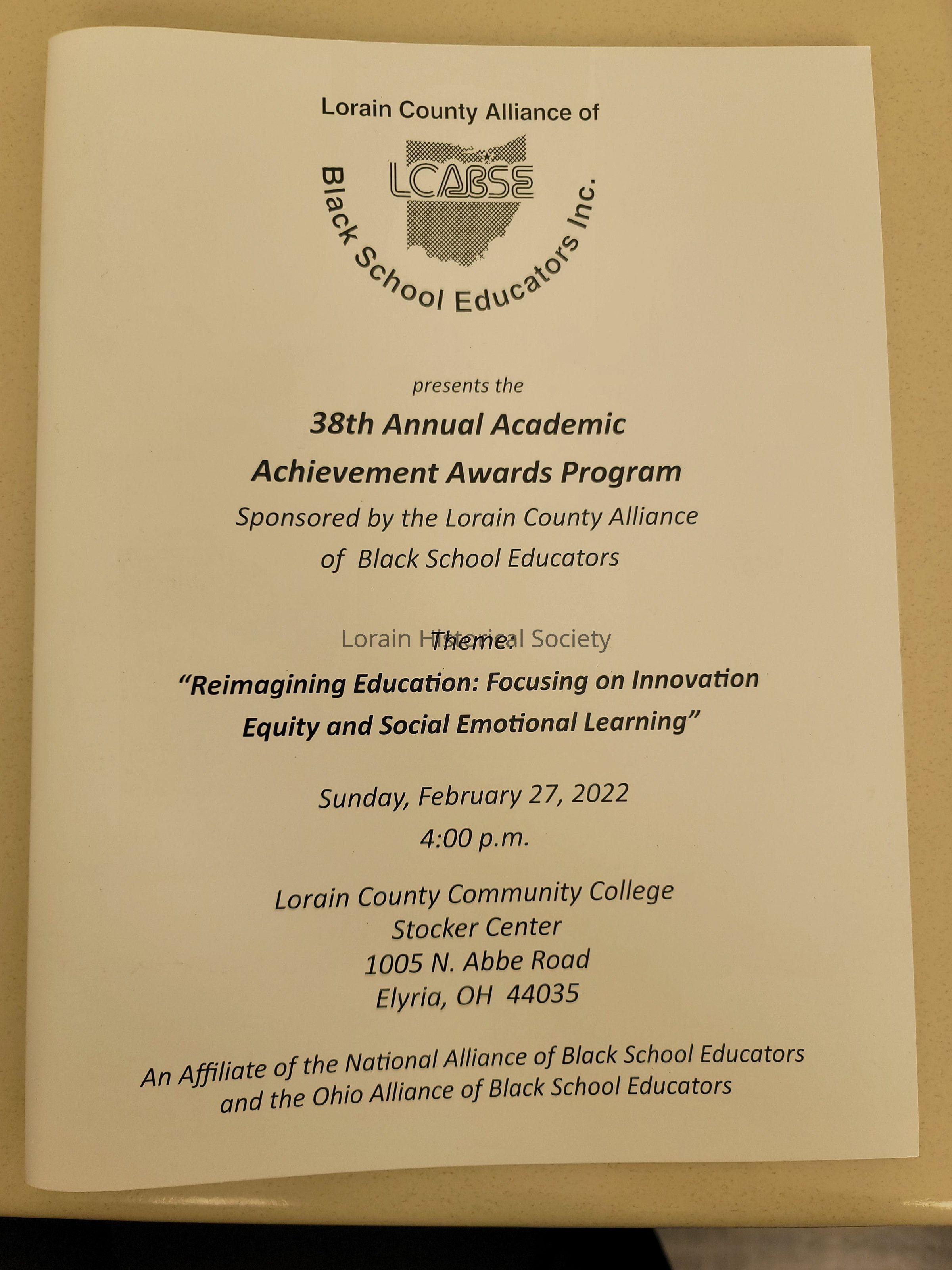Program from the Lorain County Alliance of Black School Educators Inc. (LCABSE) 38th Annual Academic Achievement Awards Program. Theme, "reimagining Education: Focusing on Innovation Equity and Social Emotional Learning." February 27, 2022Context
