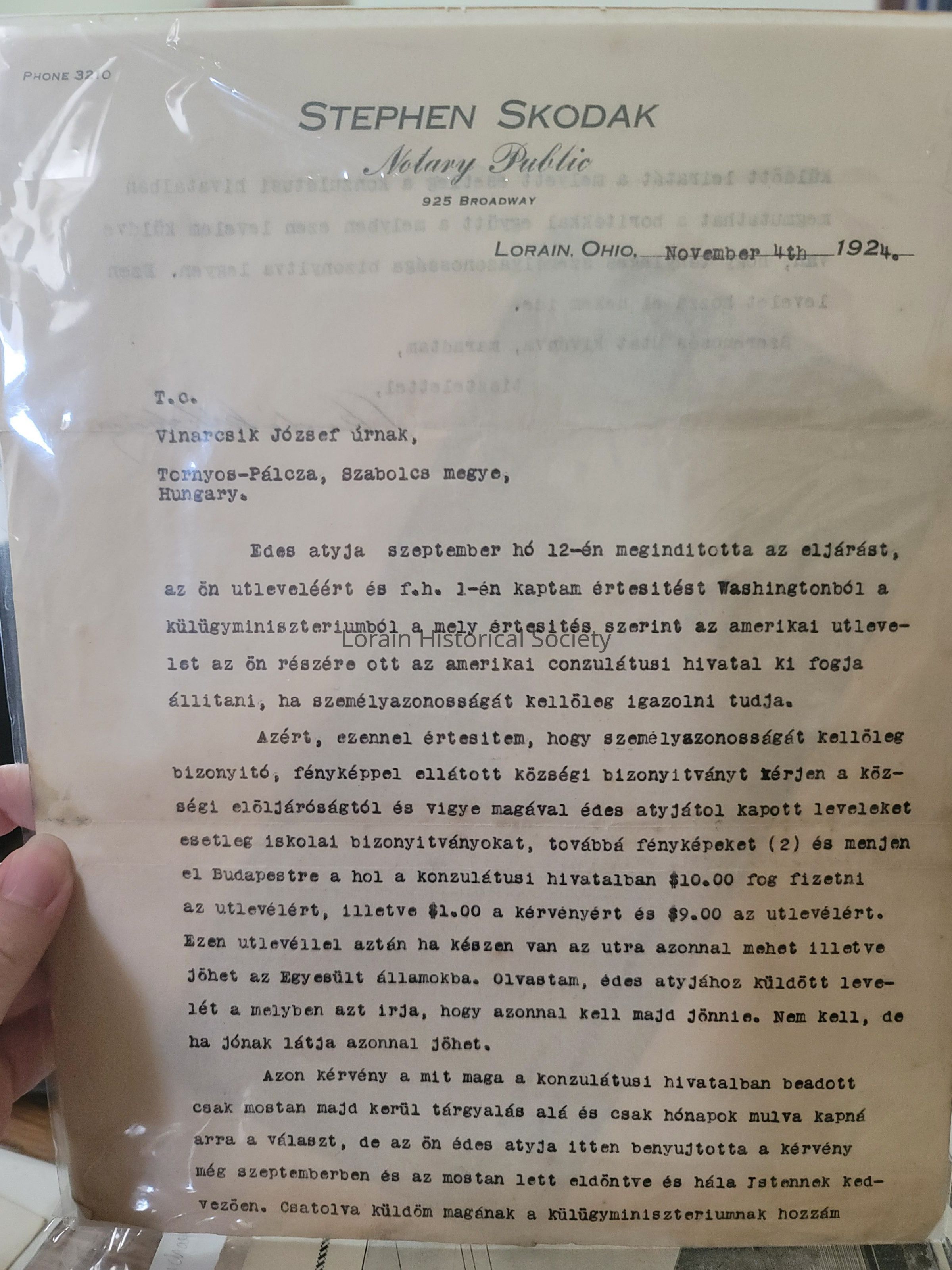 A typed letter from Stephen Skodak, a notary in Lorain, Ohio to the Ministry of Foreign Affairs in Hungary for Joseph Vinarcsik. The letter is in the Hungarian language.