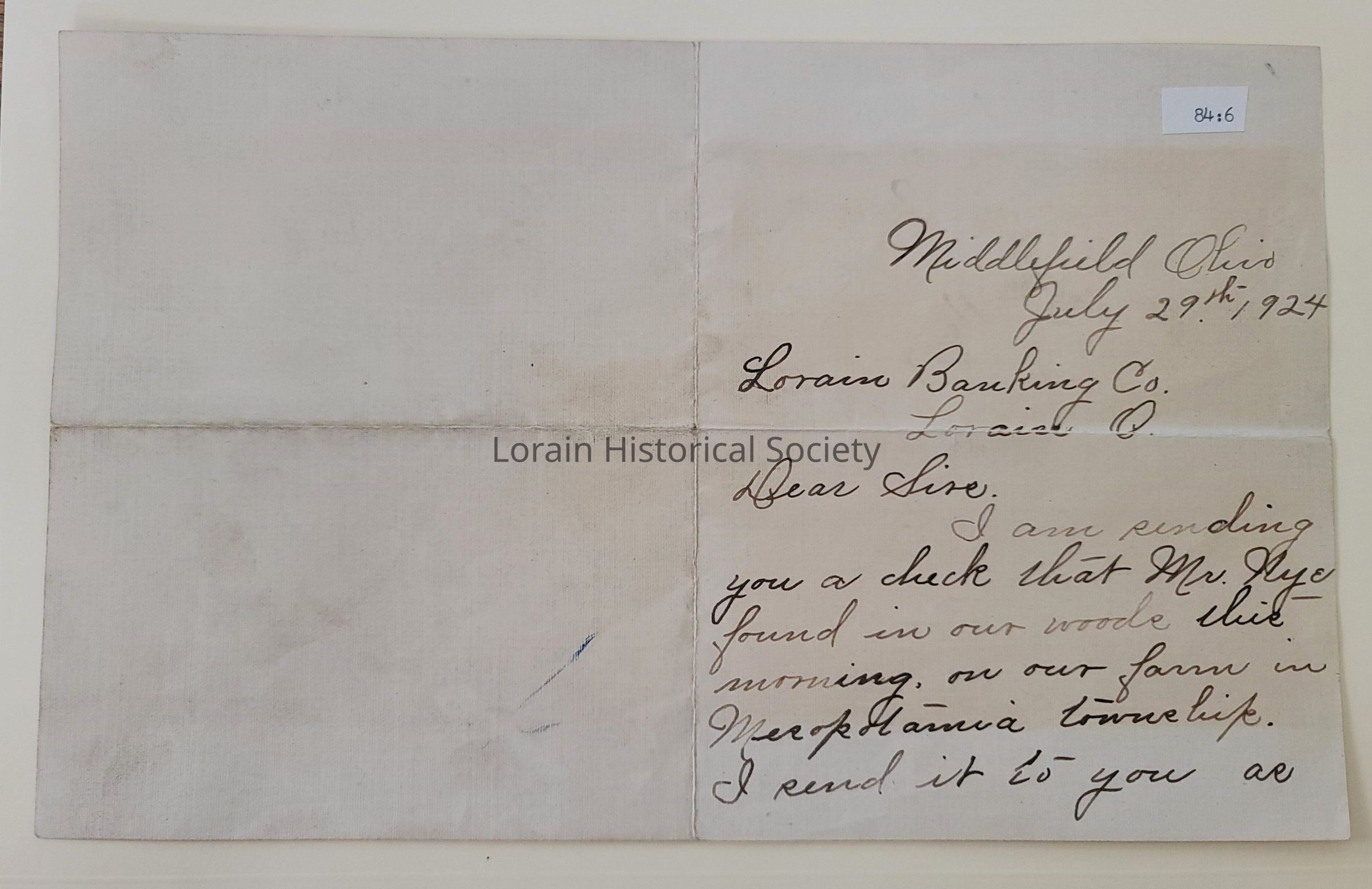 Handwritten letter sent to Lorain Banking Co. from a man, E.R. Nye, in Middlefield, OH who found the check in a woods near his home. It had blown there from the tornado and was from the Claremont Doane home. Dated July 29th, 1924.Acquisition