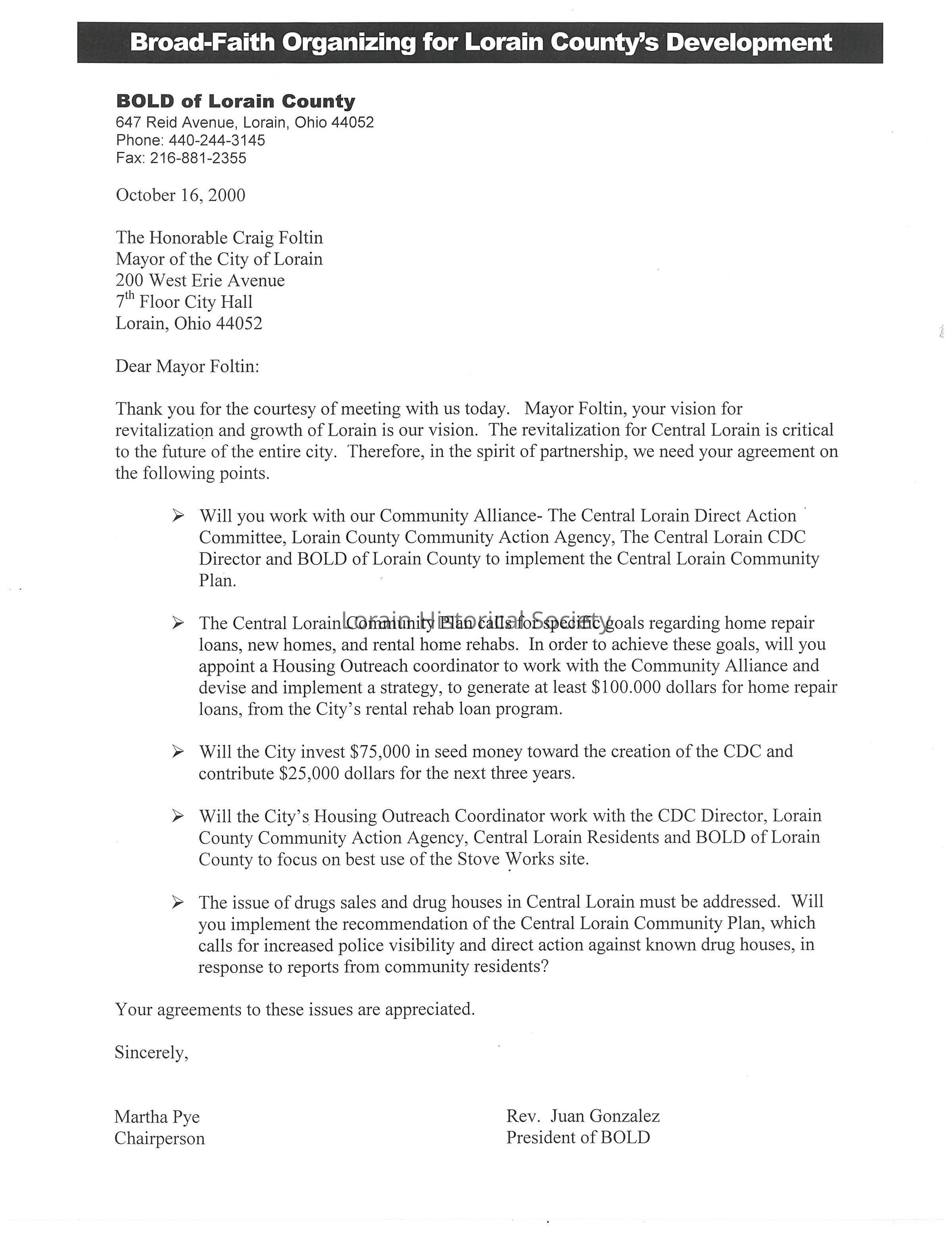 The Broad-faith Organizing for Lorain's Development (BOLD) met with the Mayor to discuss a development plan for Central Lorain in the year 2000. This letter was a follow up to that meeting. Martha Pye of Second Baptist Church was the chairperson for BOLD at that time.Collection