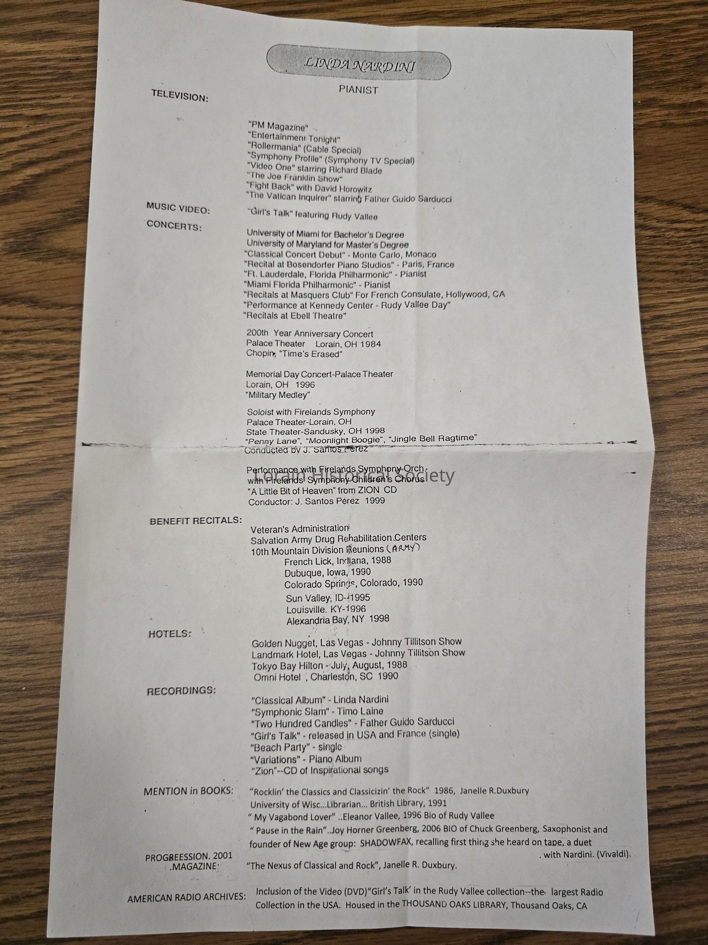 Linda Nardini, Pianist, resume of performances.Acquisition