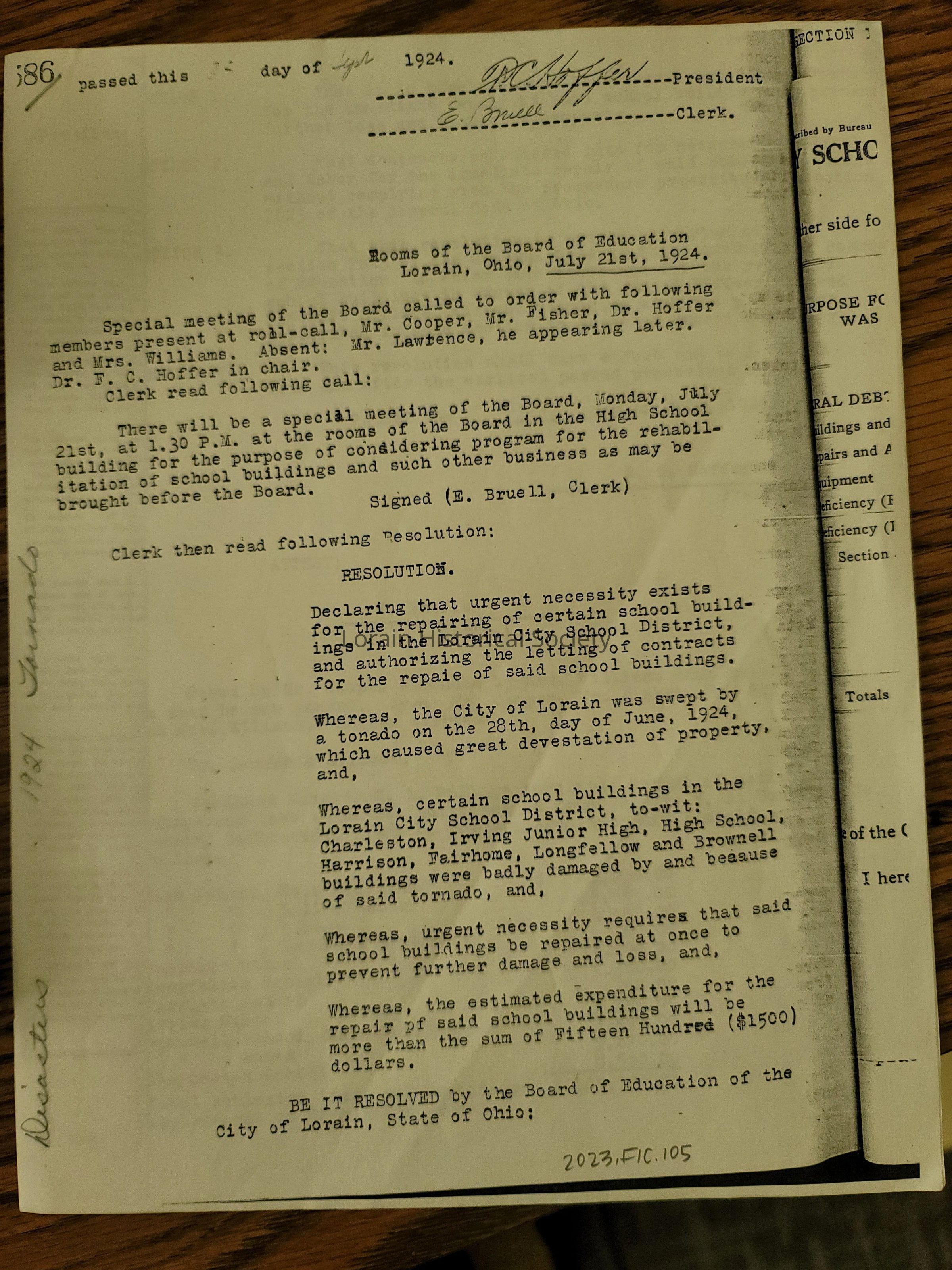 Photocopies of select pages from Lorain City Schools Board of Education minutes dated July 21, 1924.Context