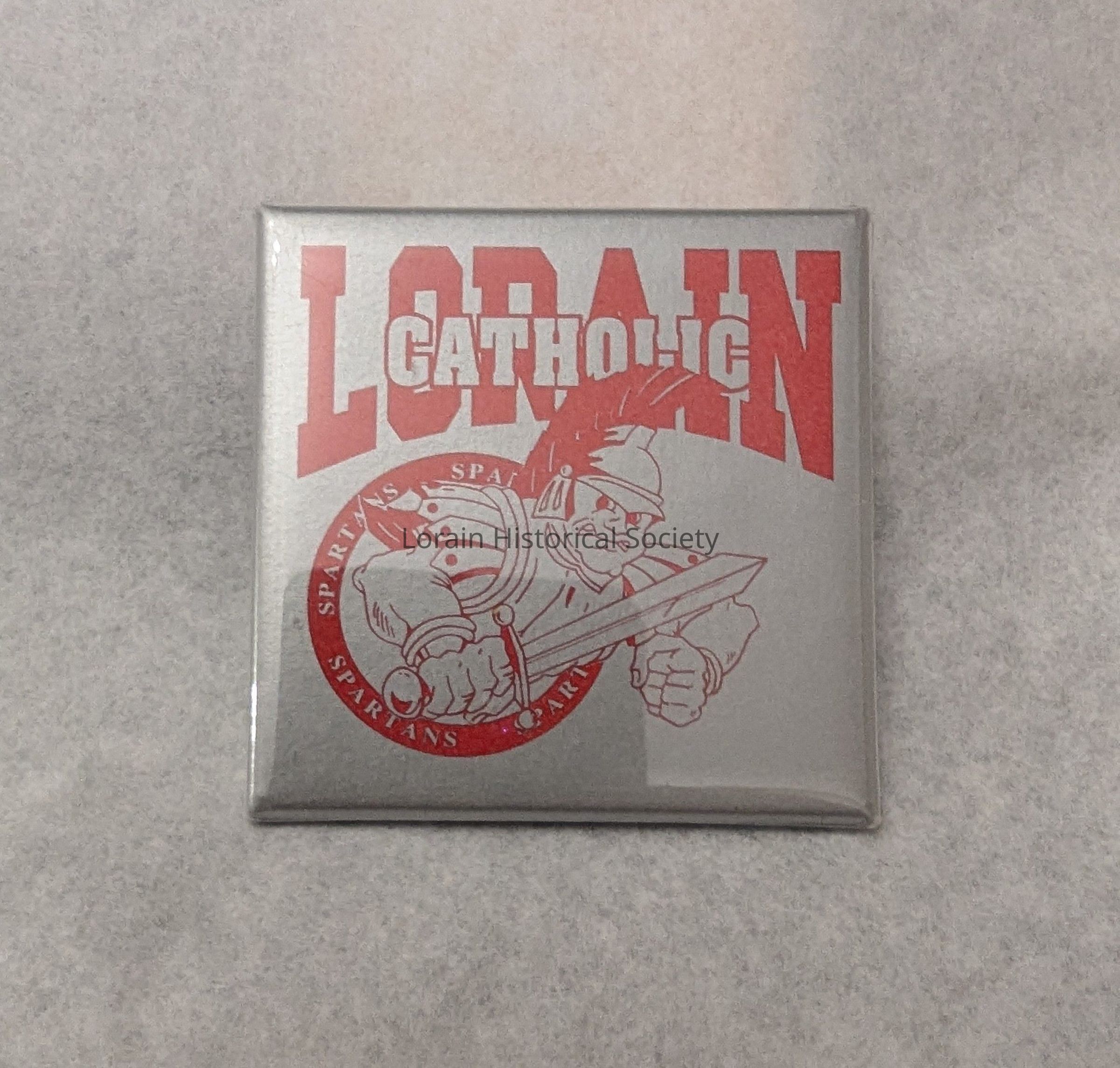 A Lorain Catholic High School Spartans pin, has the school's mascot on it, is red and gray.Collection