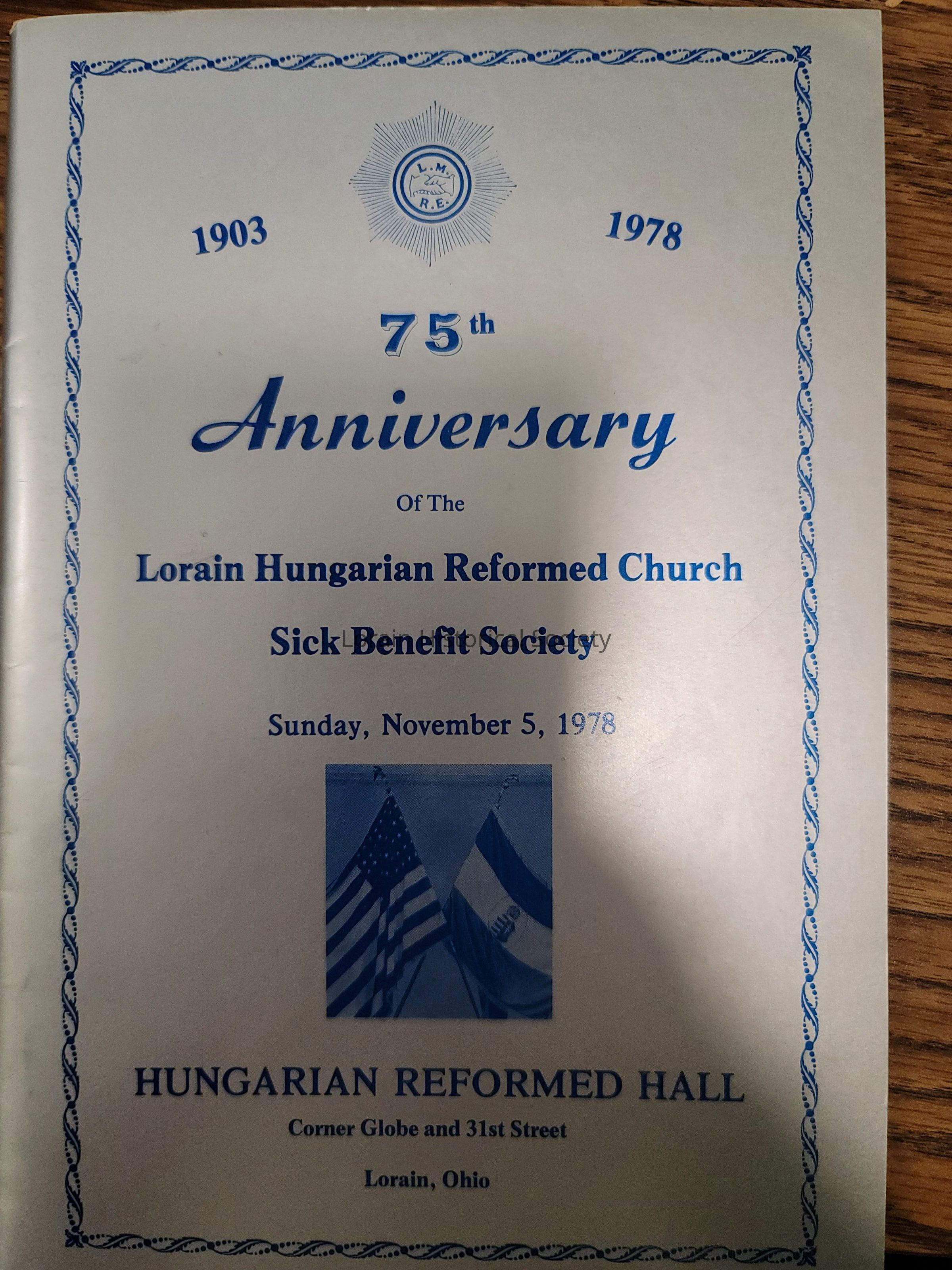 Lorain Hungarian Church Sick Benefit Society 75th Anniversary Program, 1903-1978. Held Sunday, Nov 5, 1978 at Hungarian Reformed Hall on corner Globe and 31st Street.Context